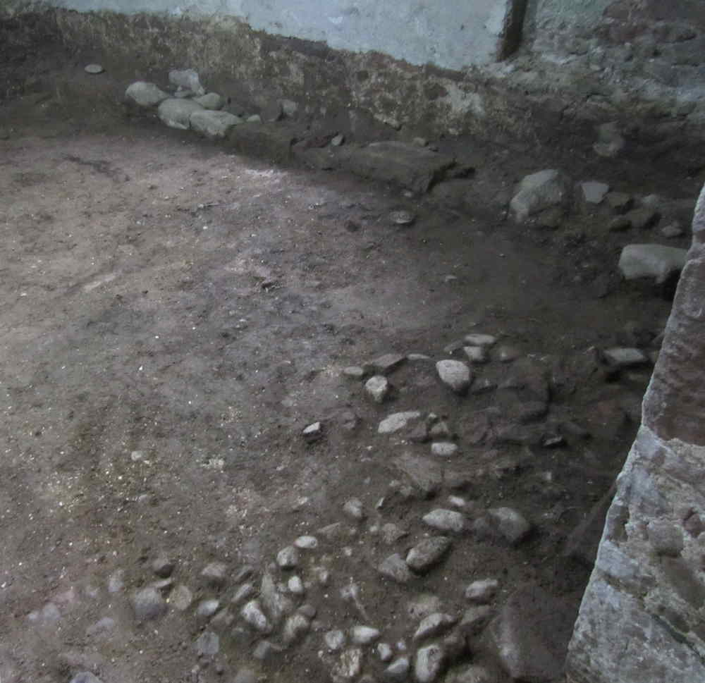 On the south side of the nave, a structure that appears almost as if it were the base of an earlier wall. A further blockwork structure lies below the alcove on the south side of the west wall, the purpose of which can only be guessed at. A scatter of stones in this area may have been just to provide a base in a wetter part of the floor.
