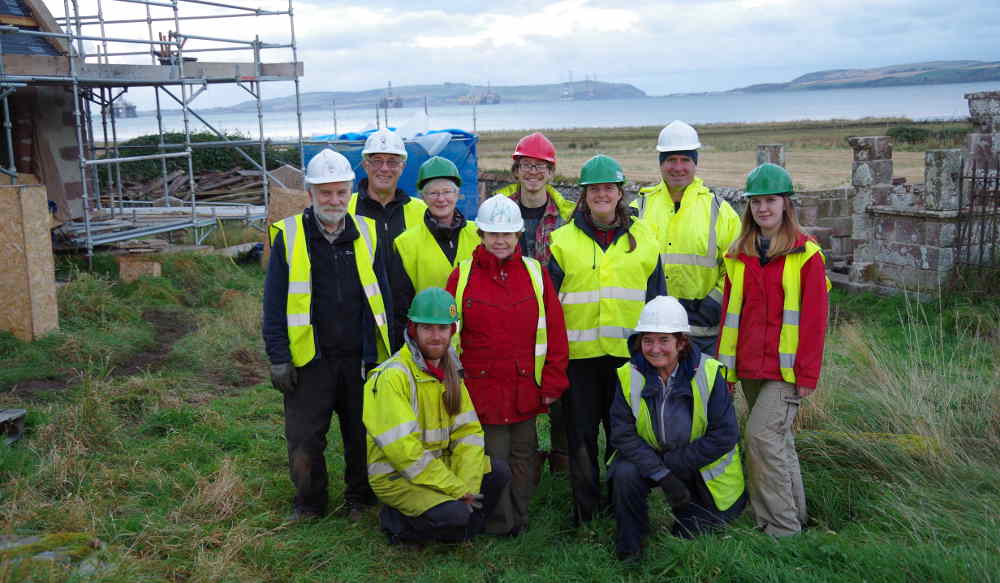 Some of our archaeological volunteers, and our Highland Archaeological Services supervisors, outside the door to the former chancel, with Udale Bay and the Sutors behind.