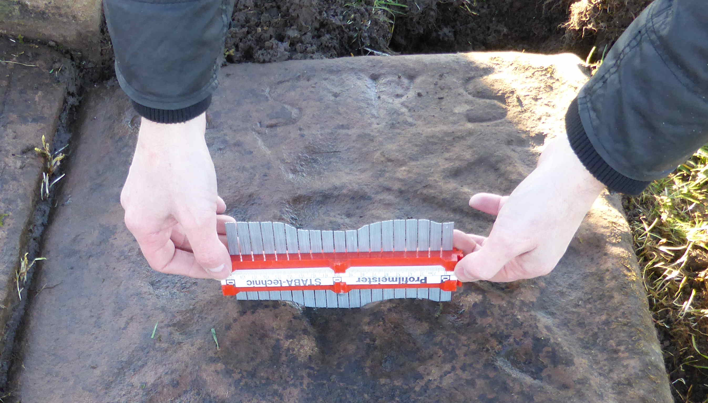 The first step was to take as much information as we could from the existing stones. Although they are worn and have been reused, there is still a lot of information. Photographs, measurements and taking profiles is where we began. Our information, together with existing data previously gathered by the Royal Commission on the Ancient and Historical Monuments of Scotland (RCAHMS), now part of Historic Environment Scotland, was used. Despite the fact that there is a reasonable amount of data, there is still some speculation as to what both stones looked like when they were originally cut.