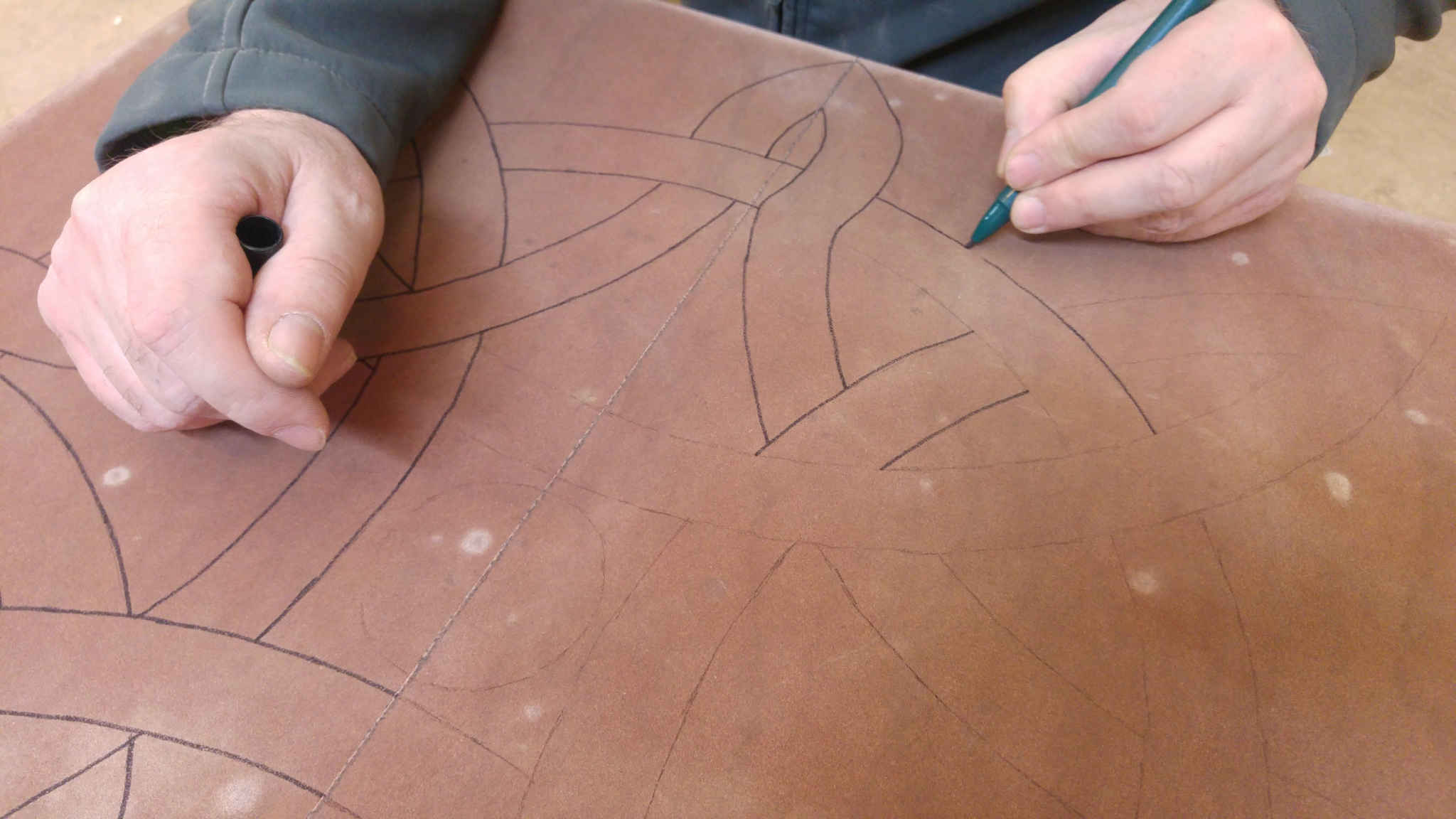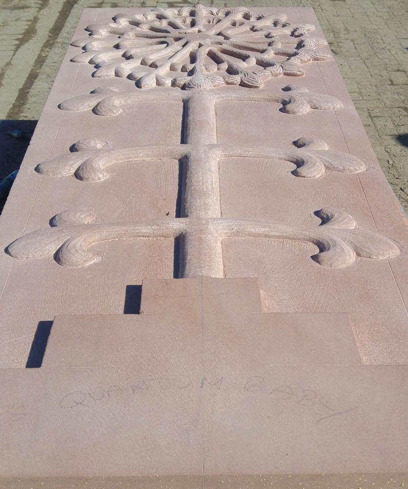 The agreed two dimensional images must be transferred to the faces of the stones. The drawings are produced to scale, and we used to multiply all dimensions by the right number, then transfer several reference points onto the stones and join the dots. That’s what we used to do. On this occasion we took a 21st Century approach and used a copy shop to produce the drawings full size before tracing the designs onto the stones.