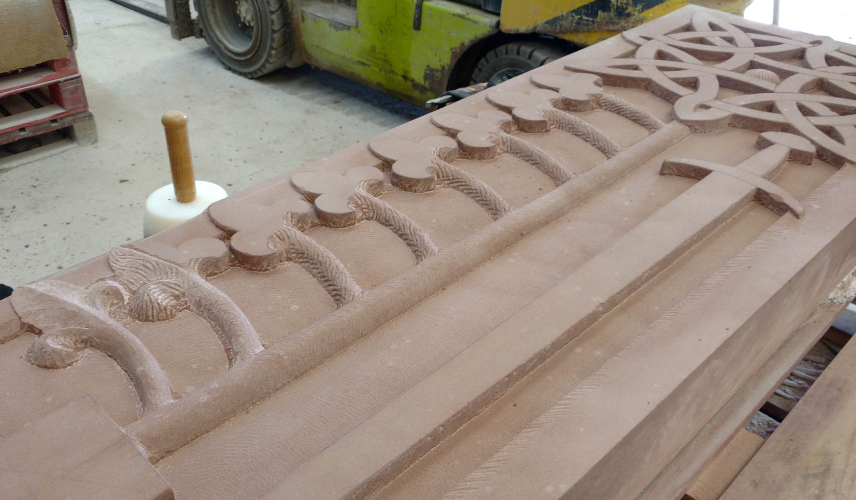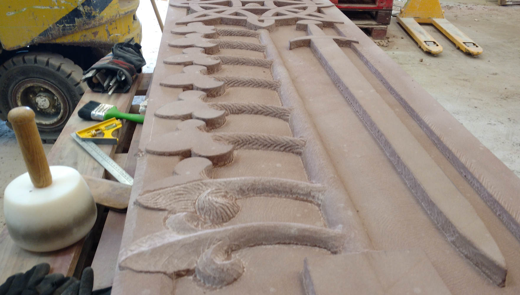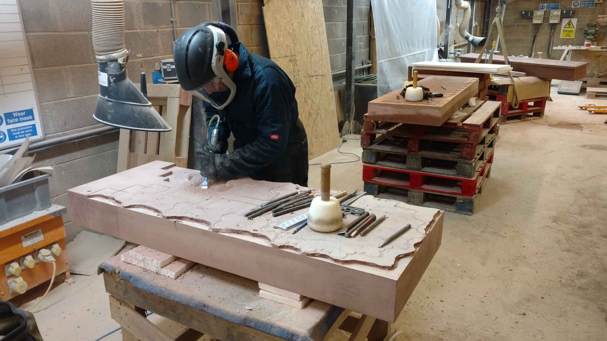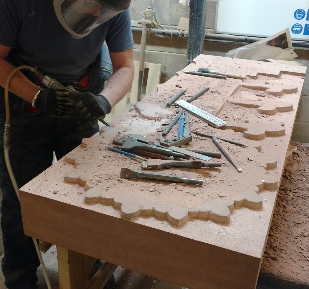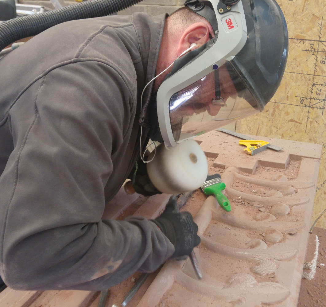 The combination of increased awareness of the dangers, improved dust control measures and better personal protective equipment means lessened health risks for the next generation of stonemasons and carvers. We’d like to thank Tradstocks Natural Stone (http://www.tradstocks.co.uk/) both for the use of their Westwood facility and for providing the St Bees sandstone block for this project.