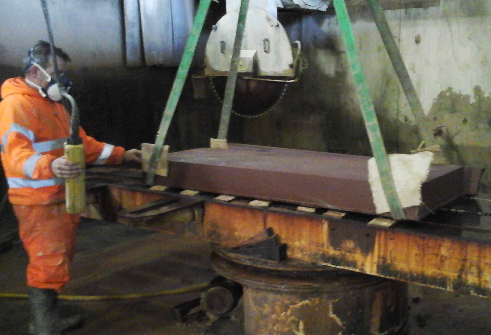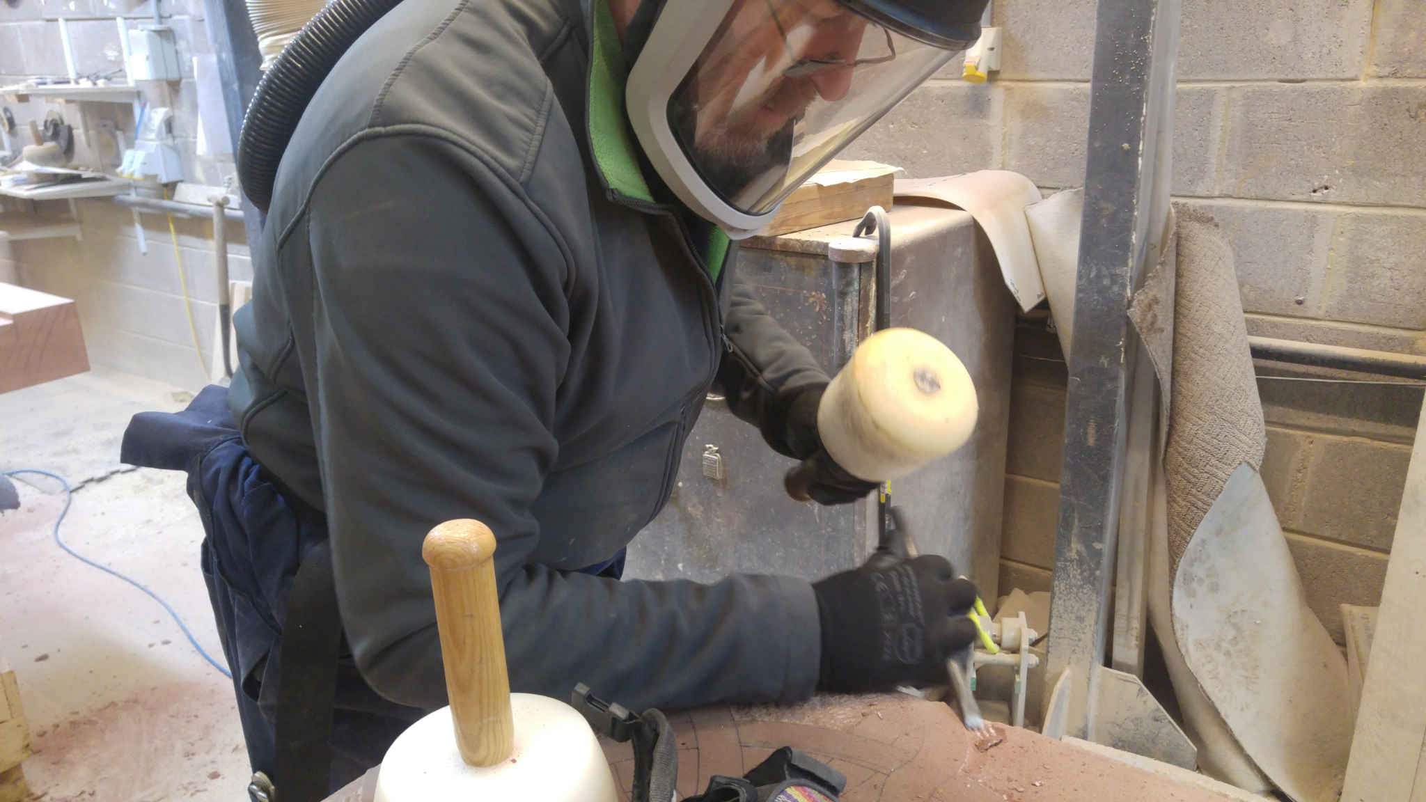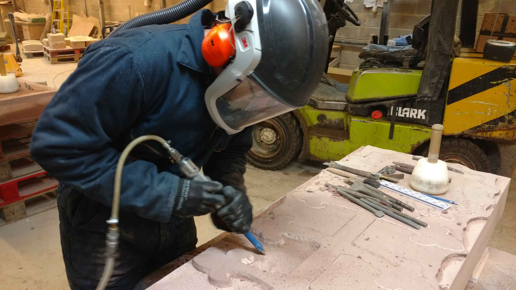 It is very important for everyone working with sandstone (and other building materials that can produce dust) to ensure they take all necessary, relevant health (and safety) precautions, such as protection against dust, for a long career. We’re both now in our 50s. Generally, feeling more beaten up at the end of the day is down to being out of practice (although it is like riding a bike) and the fact that we’re not as agile as we used to be. Understanding of the need for suitable health and safety measures has improved over the years. Now all good stonemasonry production facilities are equipped with dust extraction like the one we’re using, Tradstocks Natural Stone’s Westwood facility. We have both always used at least the recommended personal dust protection masks. We currently use positive pressure, filtered, battery powered air flow masks. The air intake is near your bottom and further away from the dust source, but that can have its own issues!