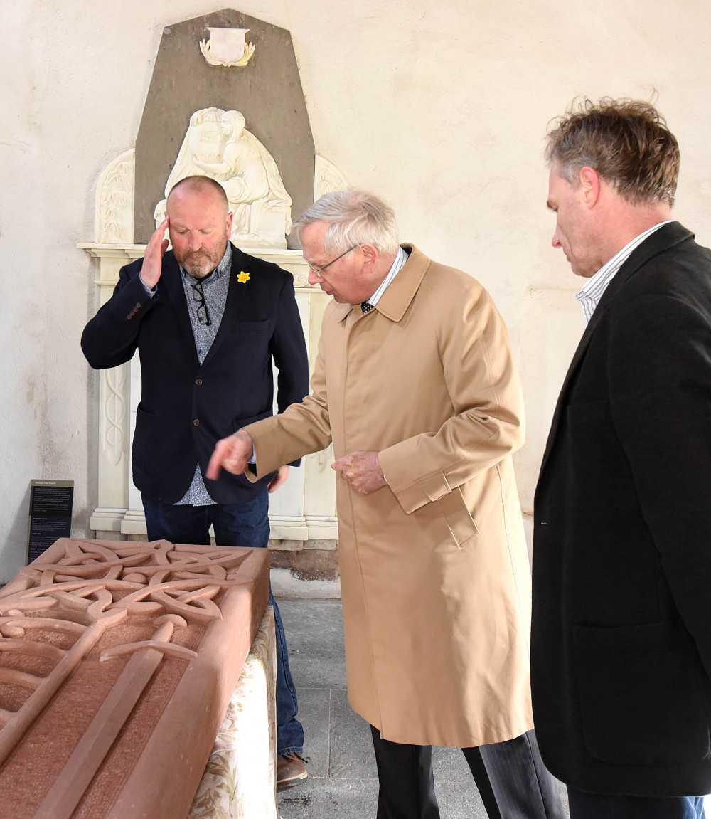 HRH The Duke of Gloucester asks Richard a question about Cullicudden F in the nave whilst David looks on.