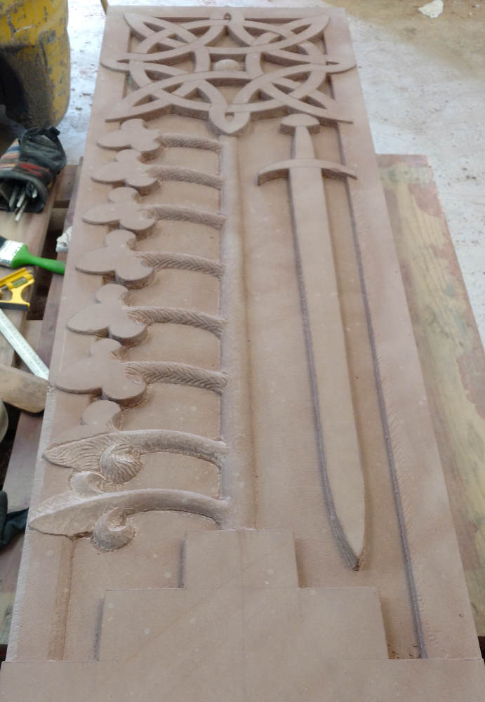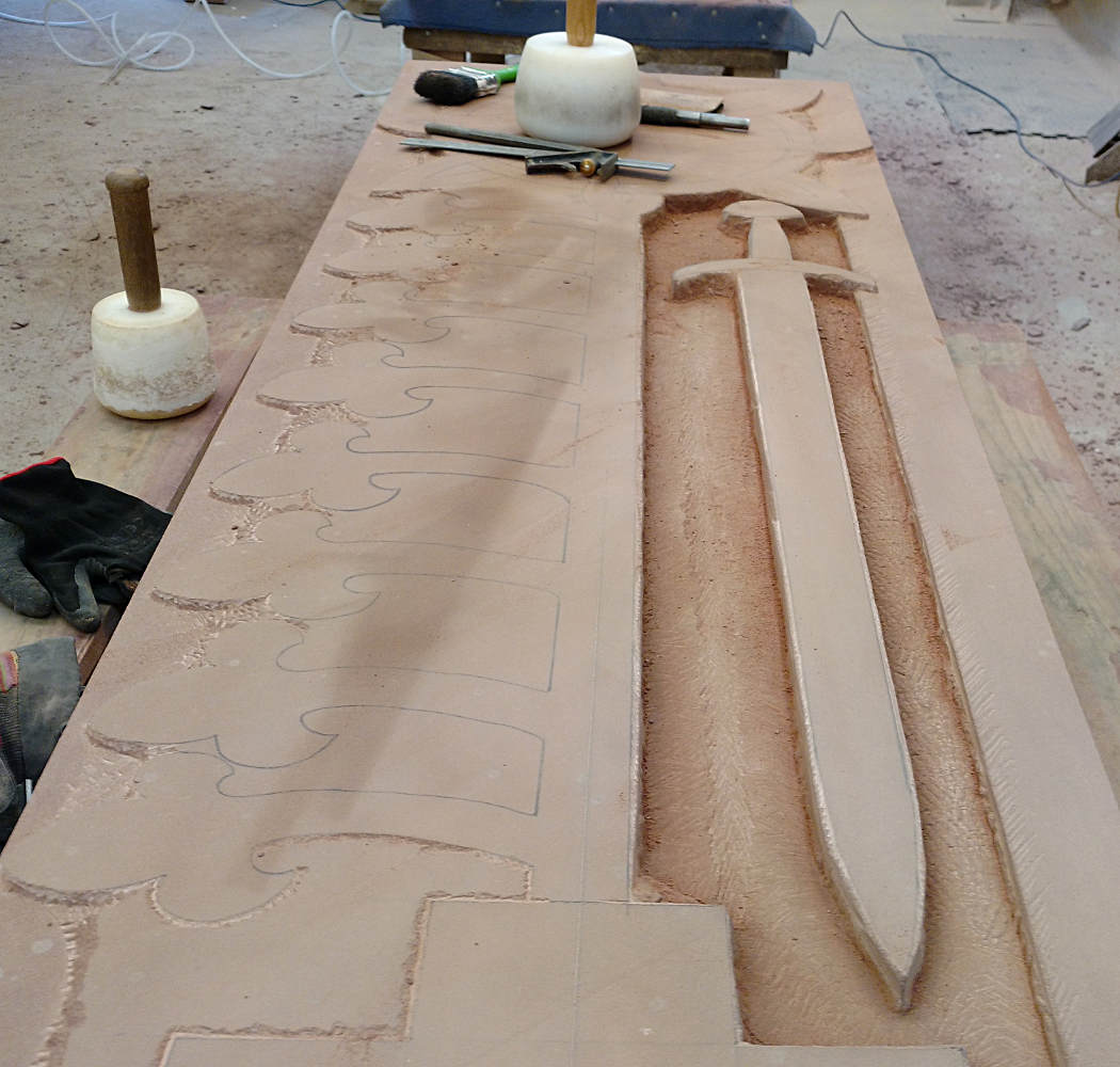 David cut the splay straight and true with sharp arrisses or edges. The original has long since lost this crispness. The choice today was to leave the edges as they were intended, or at least what we consider to be the original intention. Some of the raised elements have been polished, rubbed with harder stone until smooth, while the background has been left off the chisel. This difference in approach to the surface finishes is expanded a little further in my stone. The sunken background contained by the raised border provides me an opportunity for an additional more coarse surface finish that will allow a stronger contrast between the background and the polished surface of the sword. There are no photographs of this as yet as I’ve only just made this decision. The centuries of weathering to the original stones will have long since eliminated any differences in surface finish, but it was an approach used since, well, since the stone age. We also take care to replicate surfaces by working them with tools not dissimilar to those used originally, that is flat and pointed chisels, we only have to look at the sword to know both were available.