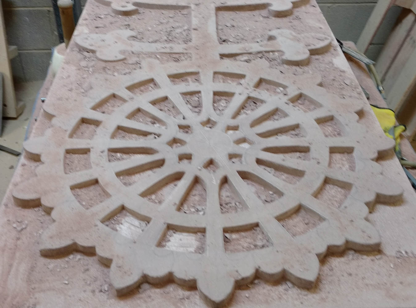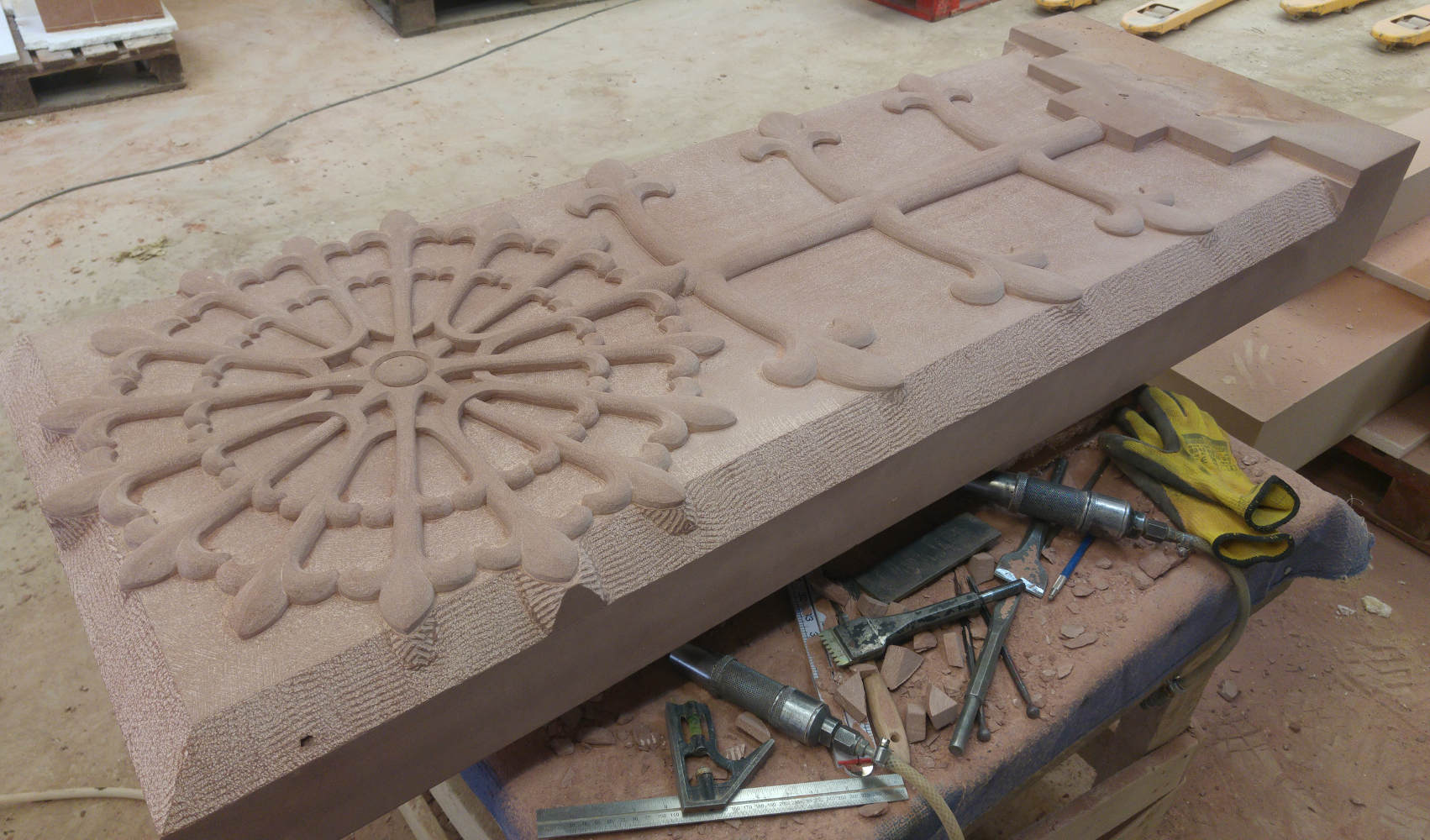 Carving stone is a subtractive process. Results are only achieved by removing material and we’ve both removed several skipfulls of waste stone over the years. We have also created clouds of stone dust. Sandstones are silica rich and silica dust is harmful to the lungs. Working on fine details means your eyes (and nose) must be close, close to the source of dust.