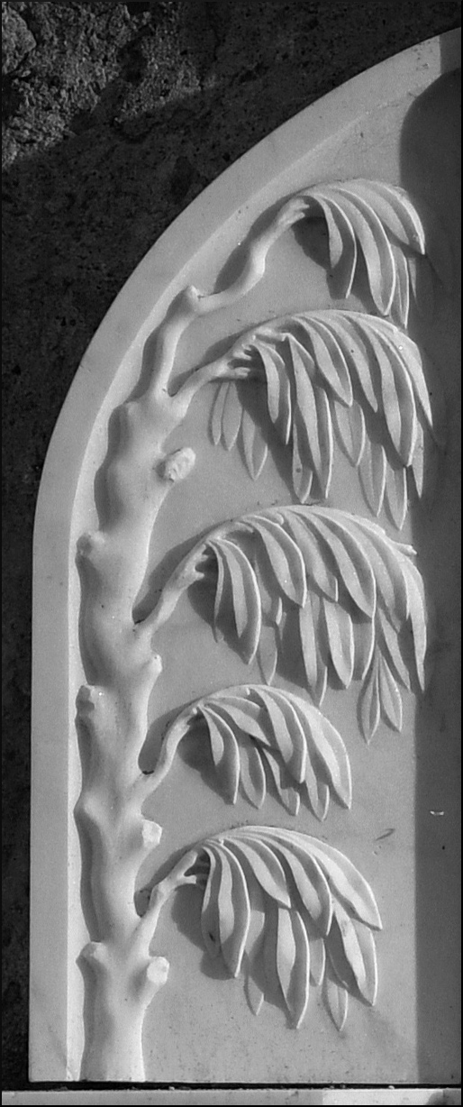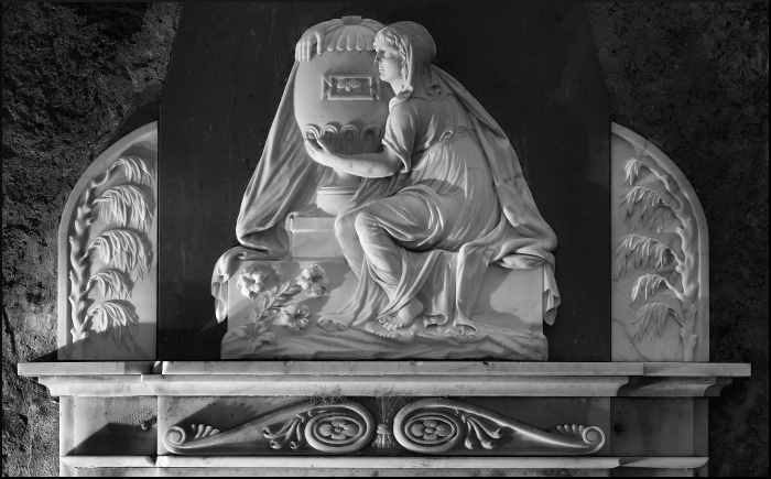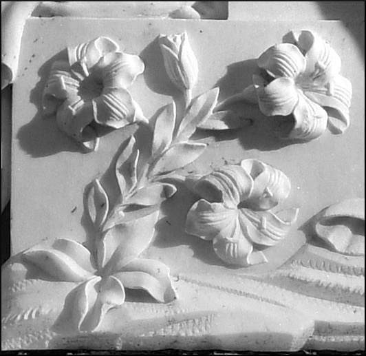 The urn, symbolising death, is clasped by Psyche indicating the love of the deceased’s relatives. The beautifully carved lilies are suggestive of purity and innocence, the symbol of Our Lady.