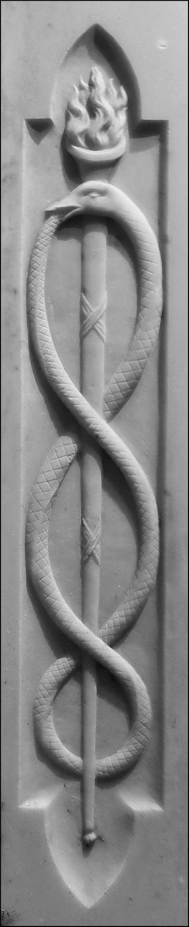 The snake biting its own tail, or ourobouros, is a symbol of eternity and thus an emblem of immortality, as is the burning torch which it curls around. The willow fronds are designed to dispel evil, purify and facilitate contact with the spiritual world. The lopped branches point to a life cut short.