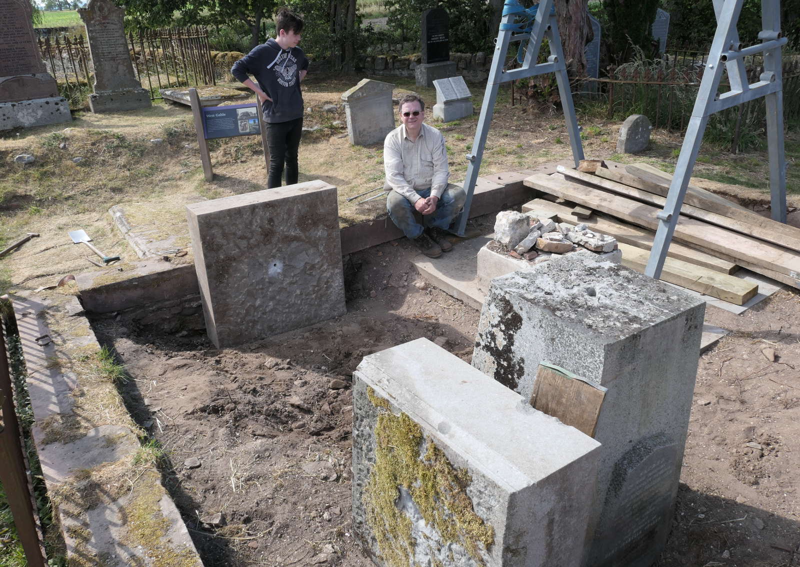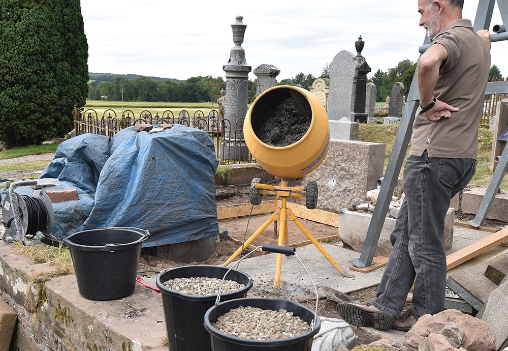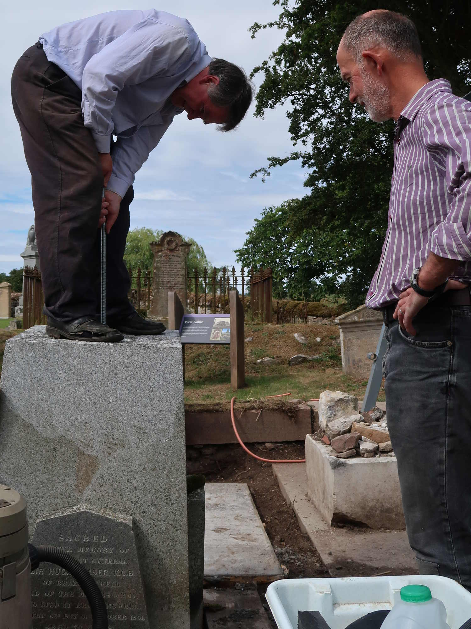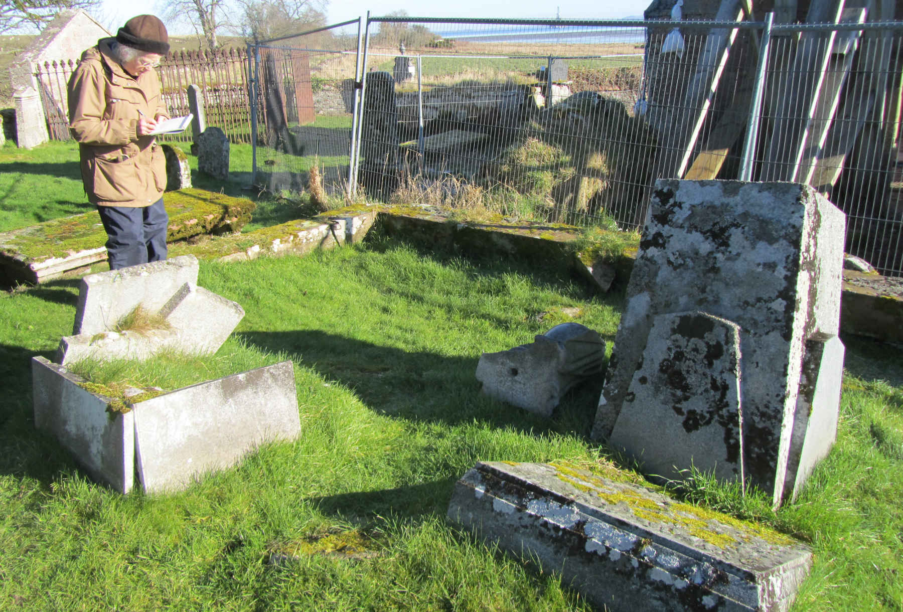 Trustee Helma Reynolds recording the condition of Sir Hugh’s collapsed memorial before restoration of Kirkmichael.