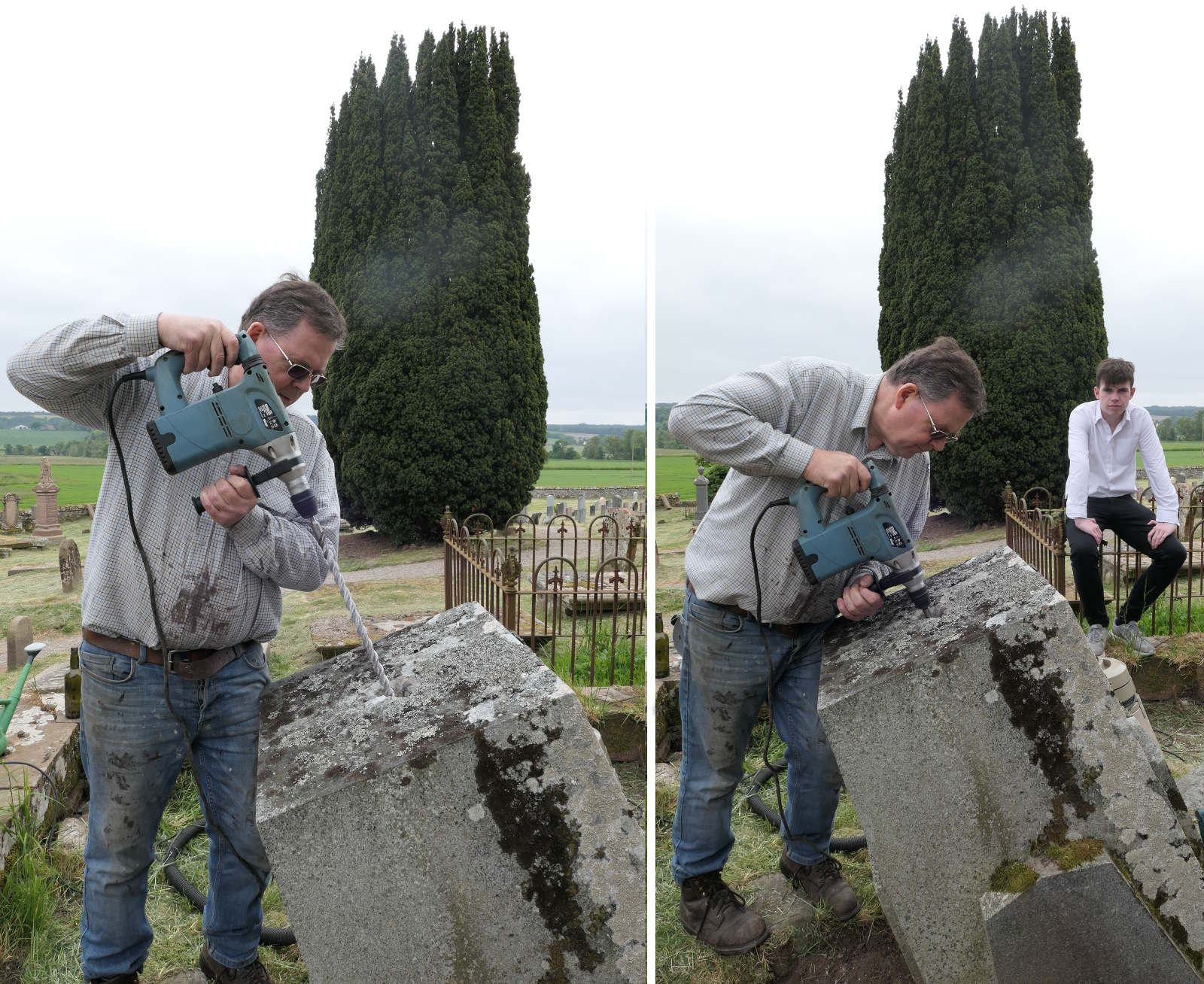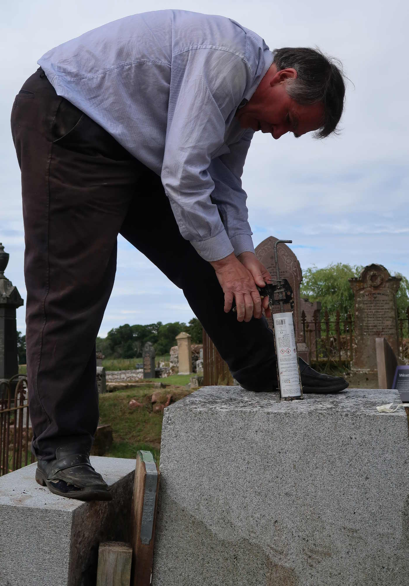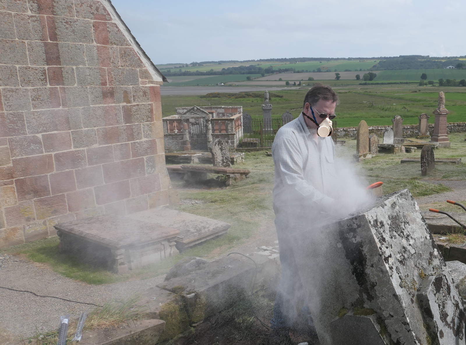 Trustee Helma Reynolds recording the condition of Sir Hugh’s collapsed memorial before restoration of Kirkmichael.