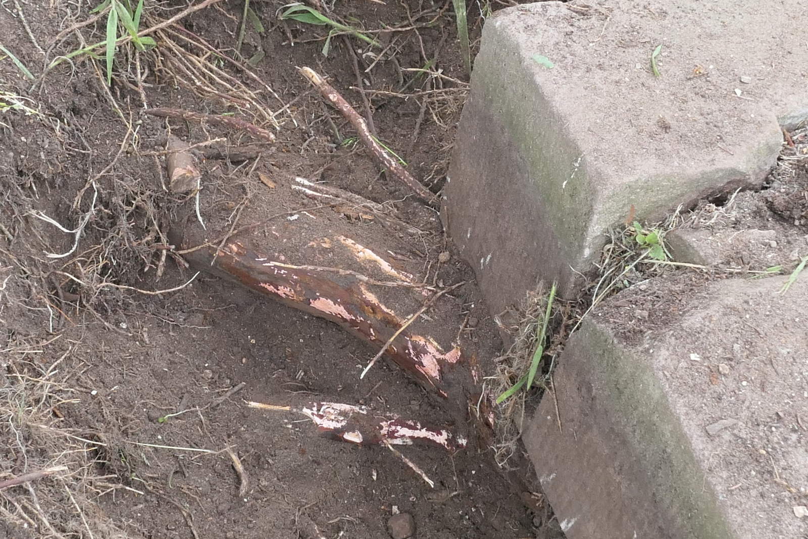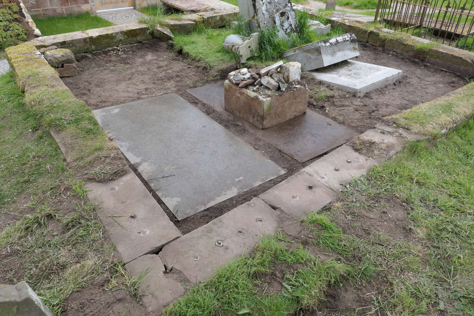 From left, an unexpected, massive granite slab; the base of the memorial to Sir Hugh’s daughter on a matching concrete slab; the plinth of Sir Hugh’s memorial – all of which had been buried under gravediggers’ spoil.
