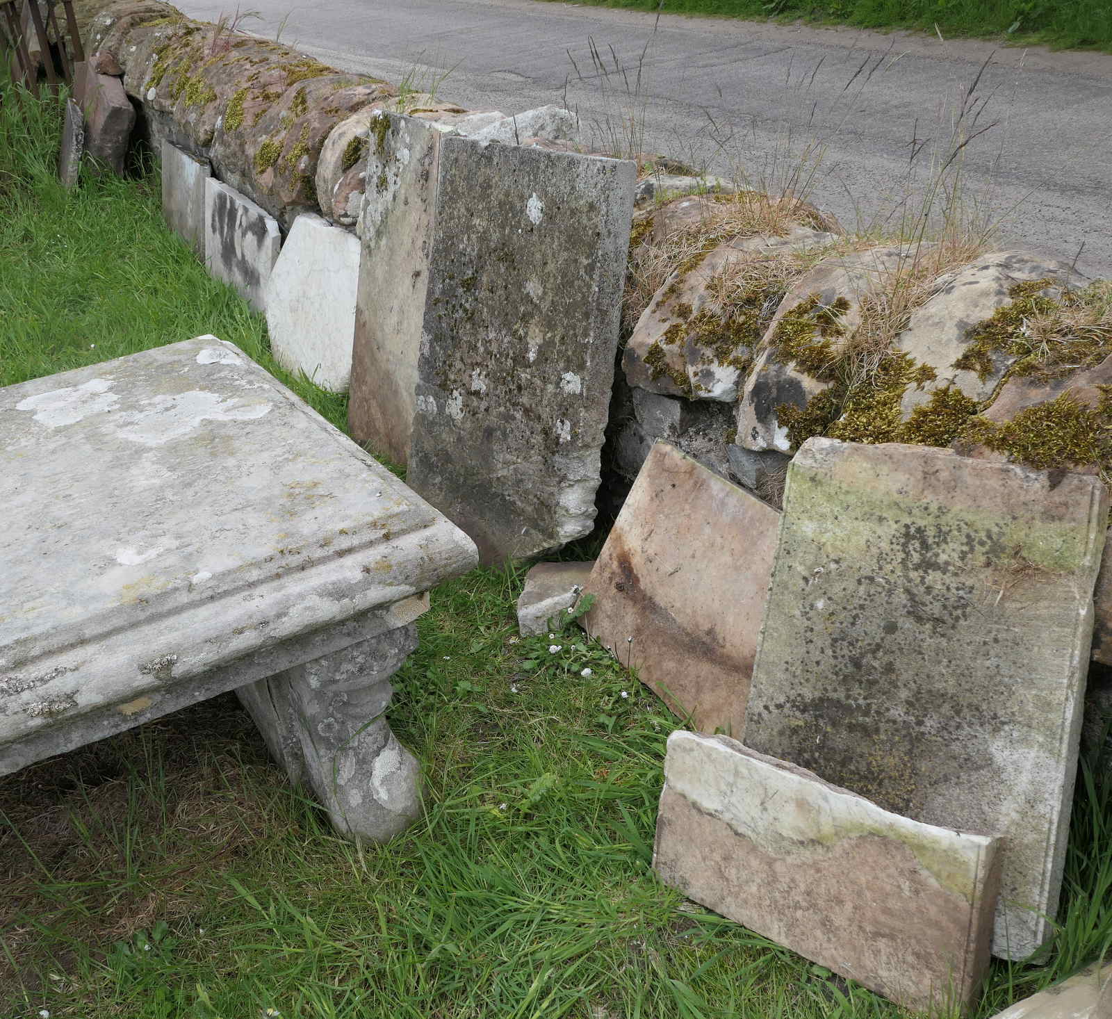 The component panels of the memorial to Sir Hugh’s daughter are stacked against the dyke prior to a later restoration.