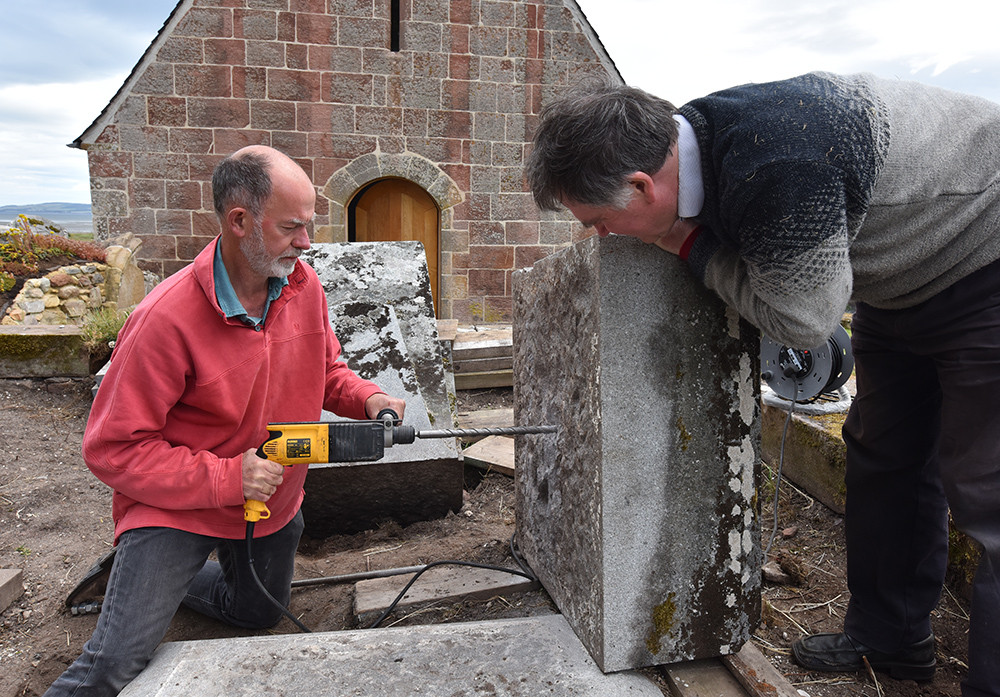 We didn’t feel comfortable with the idea of a Lewis pin so we used my hefty SDS drill to continue the existing hole in the top of each block right through and out the bottom. We couldn’t do this for the big pyramid as it was too deep, but we successfully achieved it for the others. We could then insert a 20 mm threaded steel rod down through each block and attach a plate and nuts below. The winch on the Kirkmichael gantry could then lift the block.