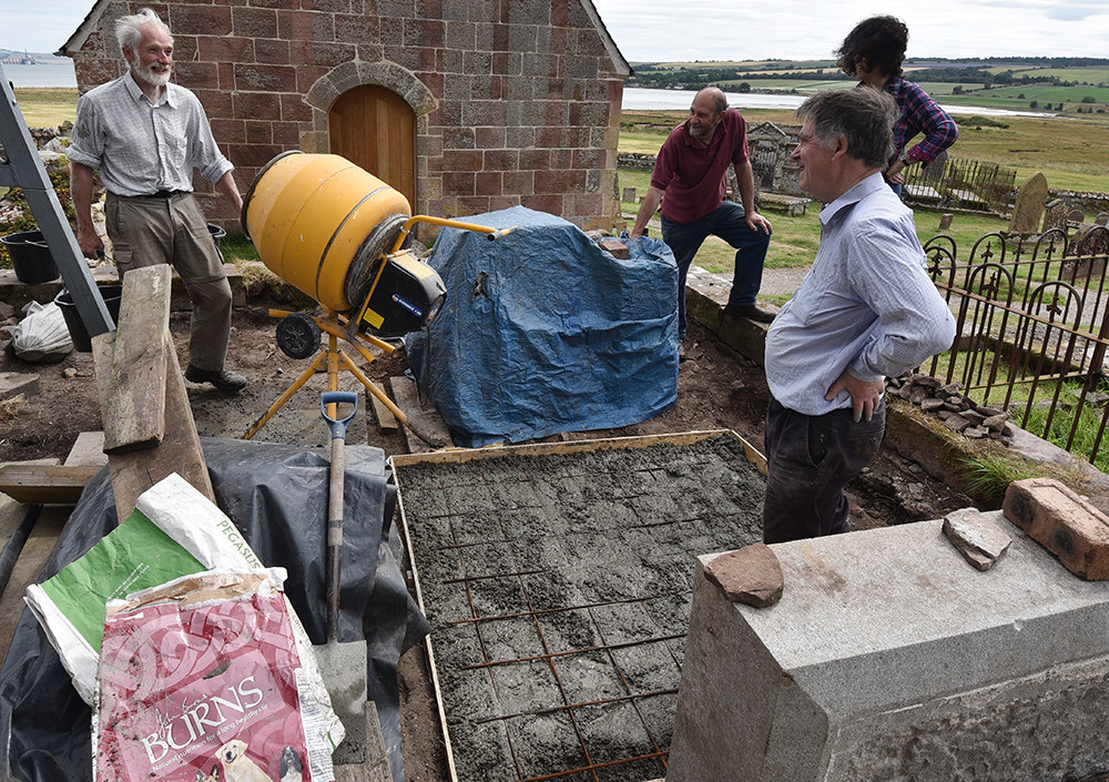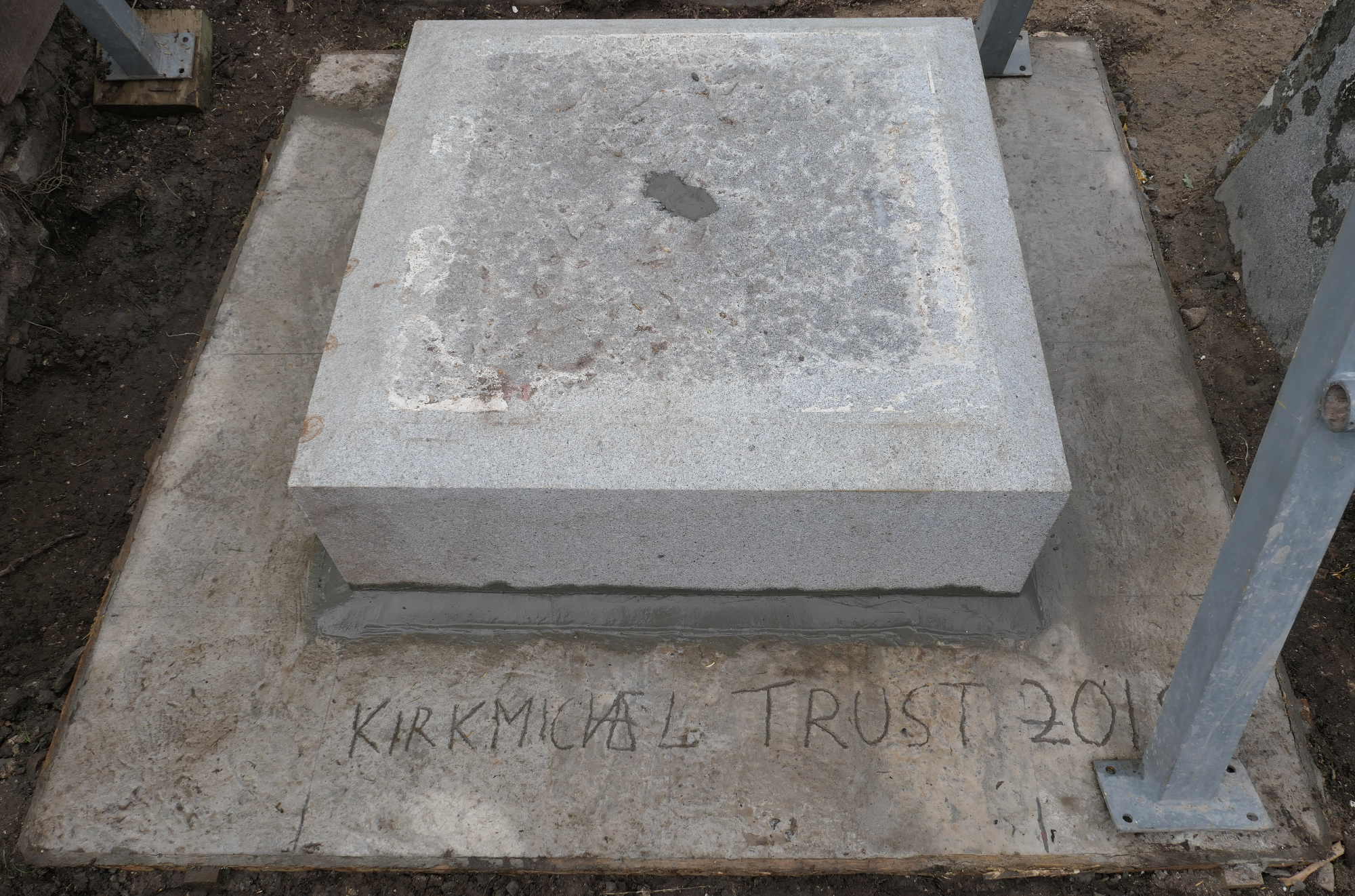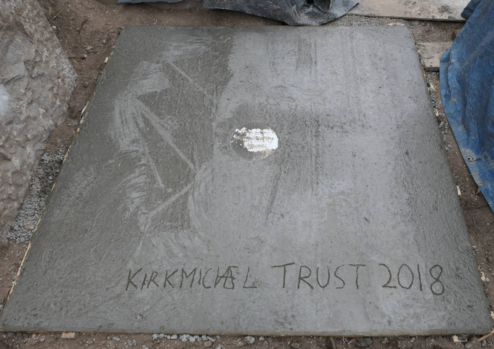 As the plinth would have a steel plate and two nuts projecting from its base, we inserted into the wet concrete a square of swede (as a cavity for the nuts) and a circle of polystyrene (as a cavity for the steel plate). It did look a little odd! We added a Kirkmichael inscription, complete with ligatures and date, and laid plastic sheeting weighed down with sand to keep it moist whilst curing.