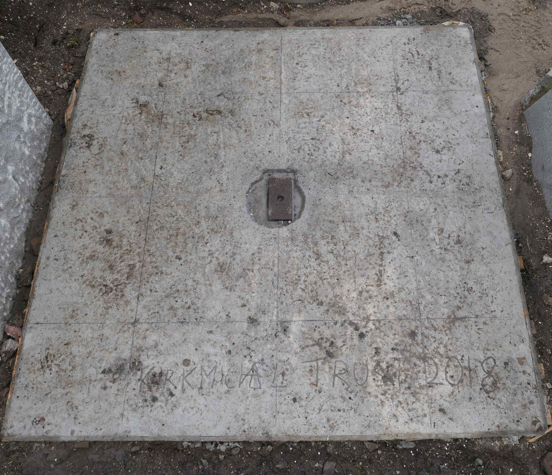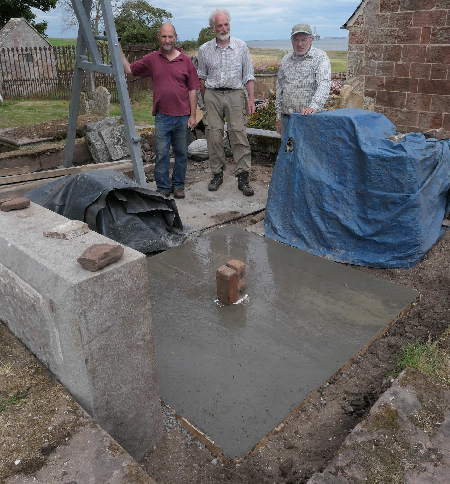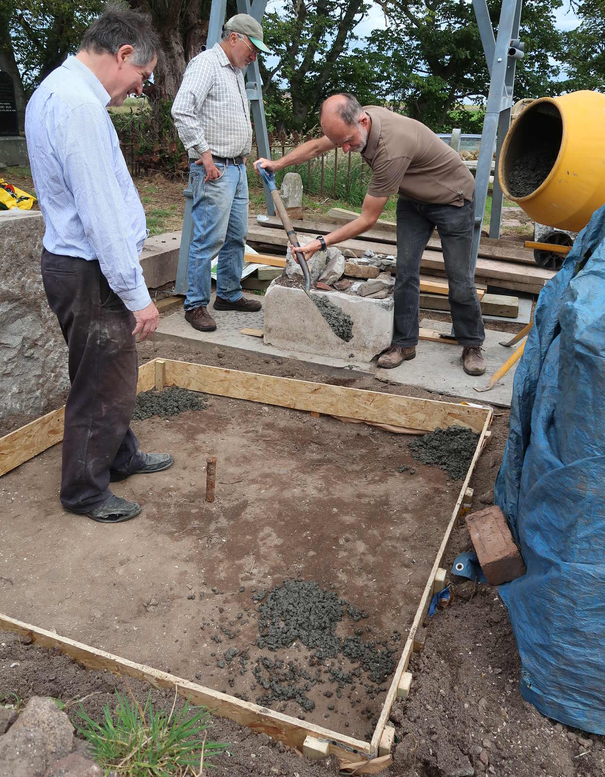 As the plinth would have a steel plate and two nuts projecting from its base, we inserted into the wet concrete a square of swede (as a cavity for the nuts) and a circle of polystyrene (as a cavity for the steel plate). It did look a little odd! We added a Kirkmichael inscription, complete with ligatures and date, and laid plastic sheeting weighed down with sand to keep it moist whilst curing.