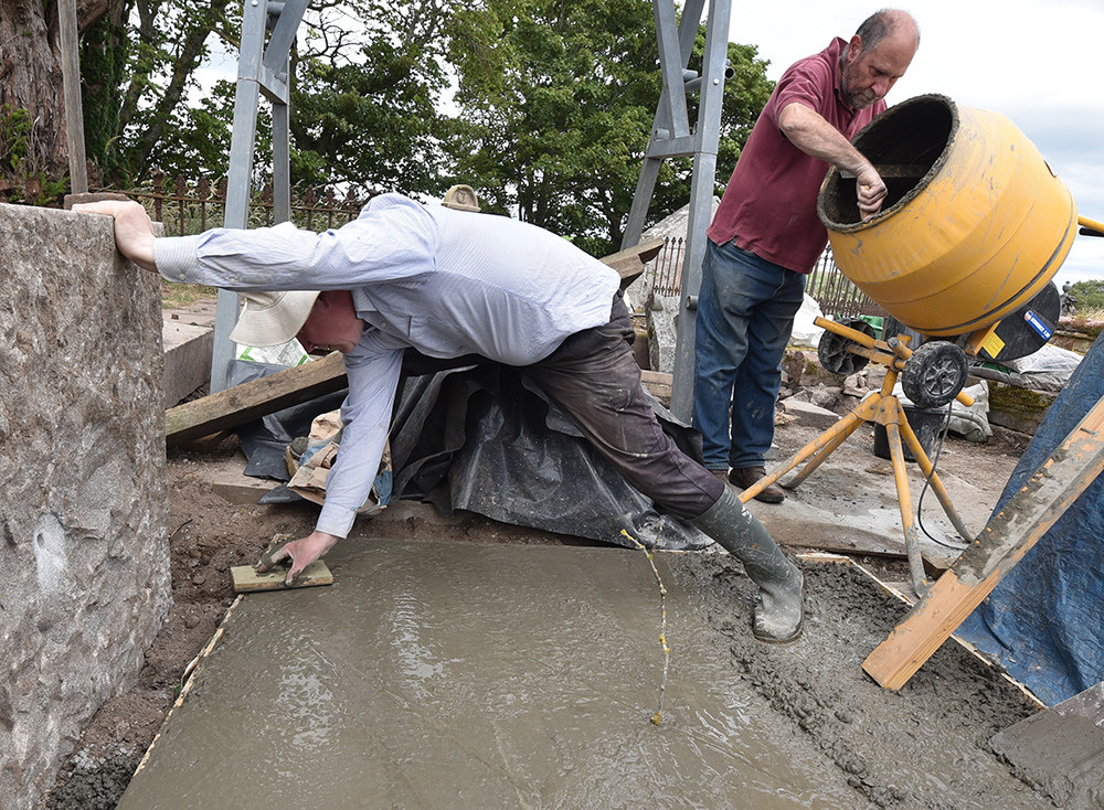 With the blocks moved out of the way, we had the space to create a level foundation. The plinth was roughly 1 metre square, so we determined on a 3 metre square concrete foundation. We took in my electric cement mixer and filled up the shuttering with 150 mm of a 4:2:1 mix of gravel:sand:cement, with steel mesh to reinforce the concrete.