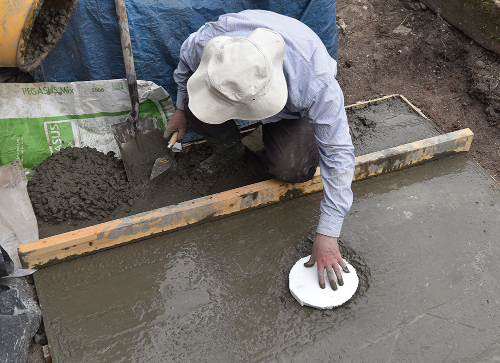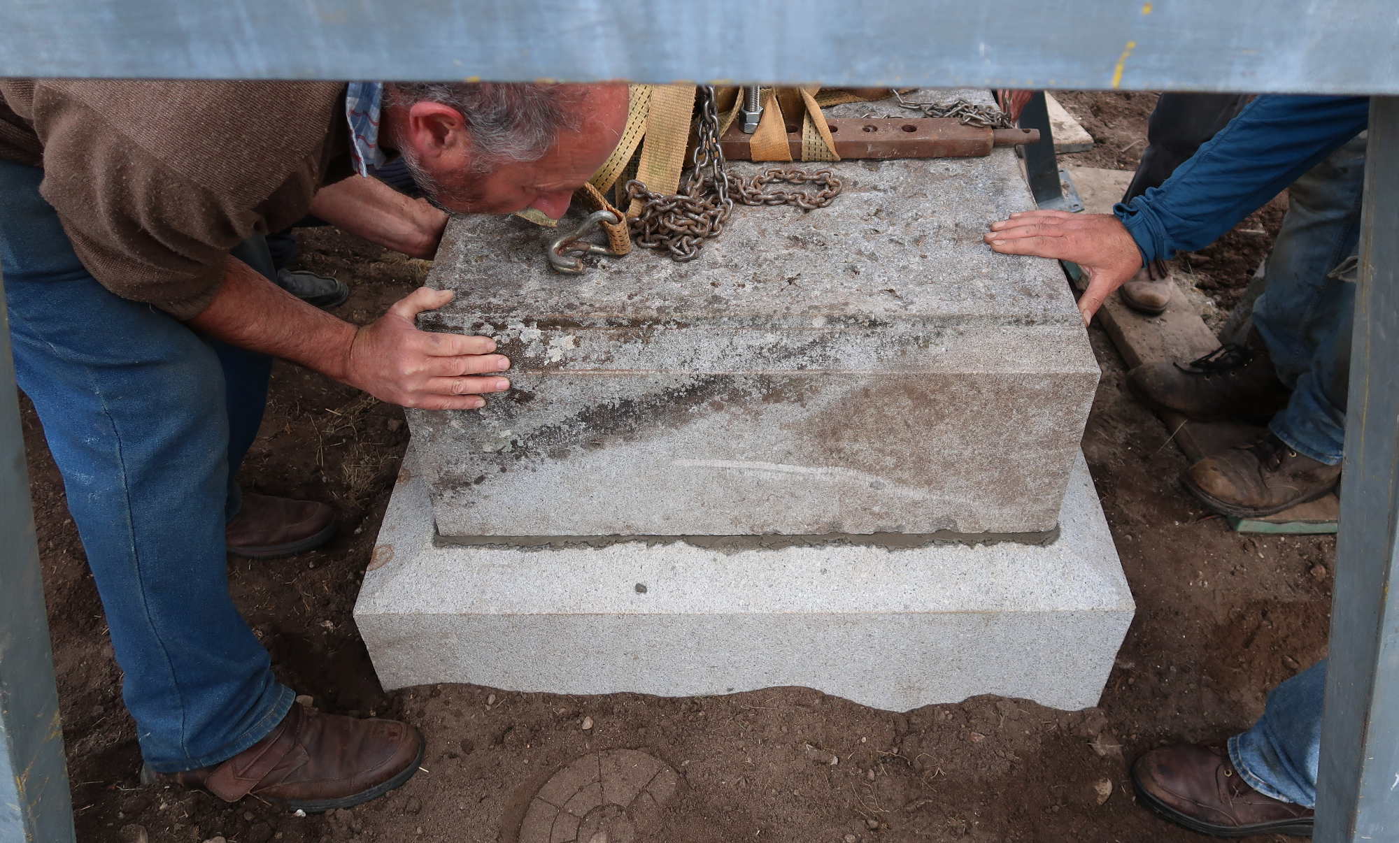 Plinth carefully lowered onto the premarked square.