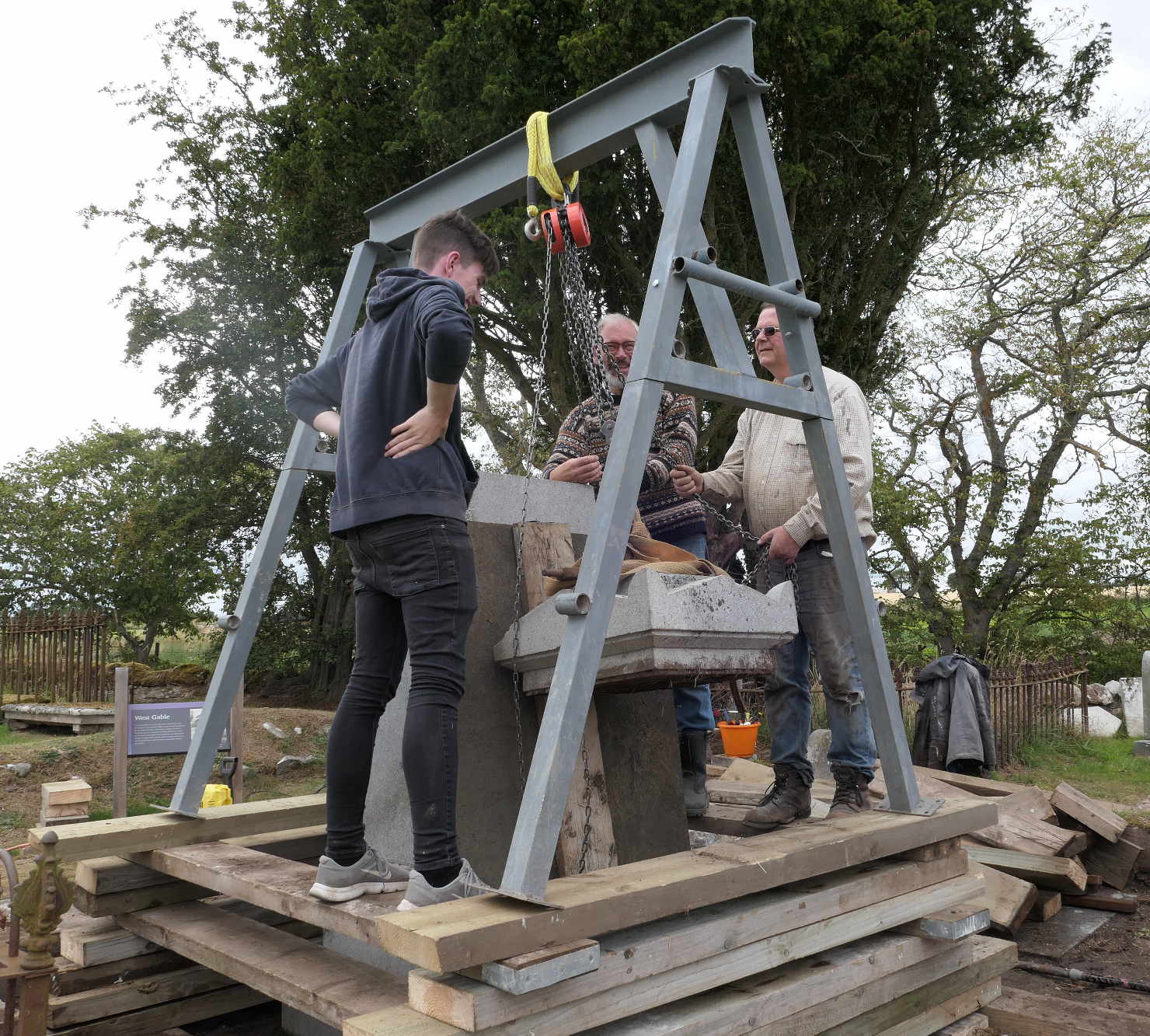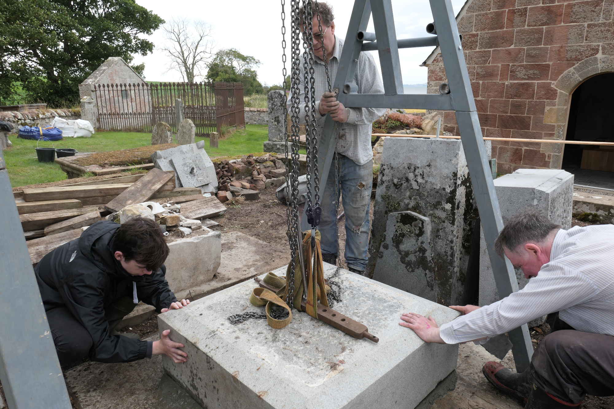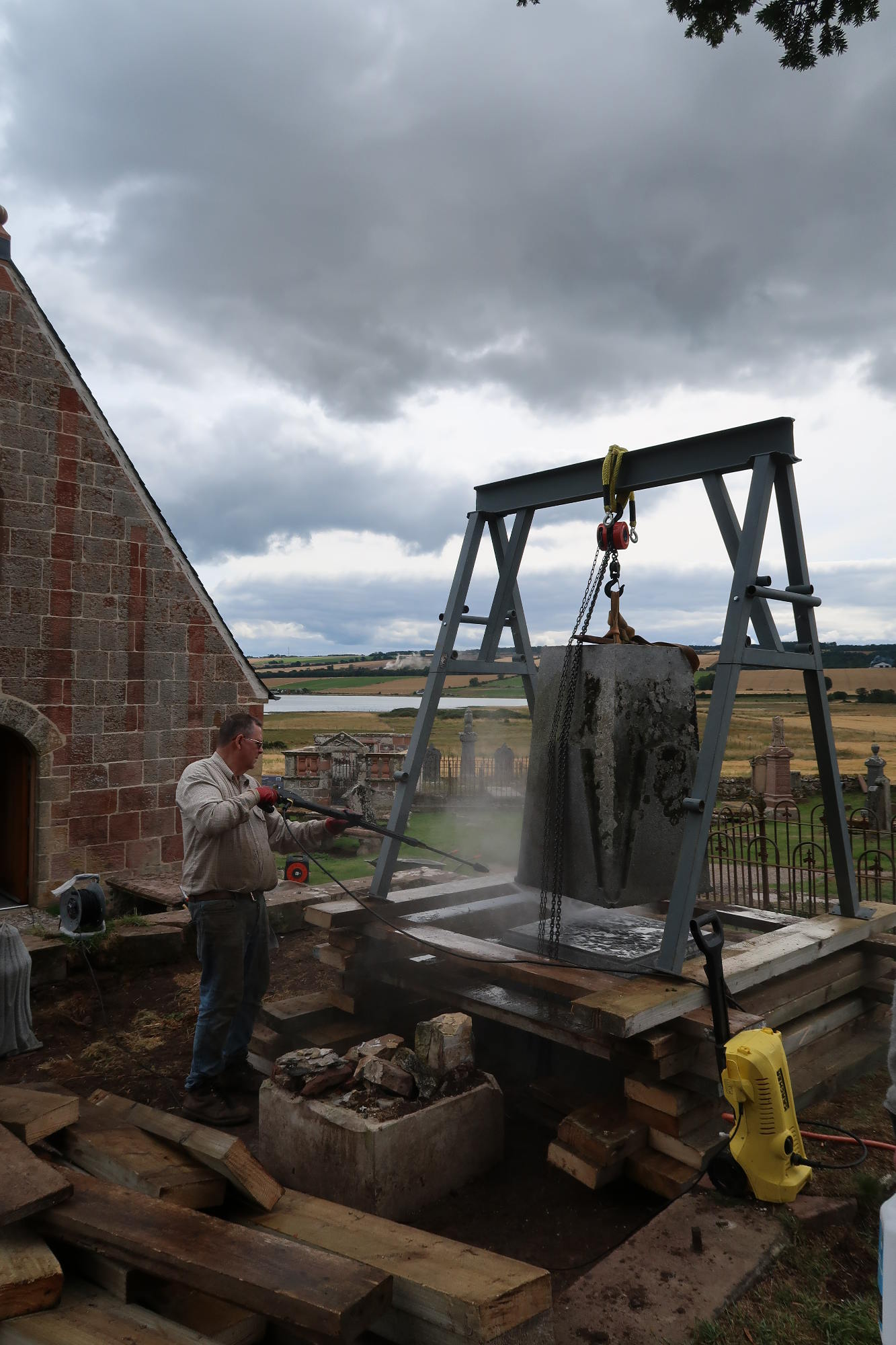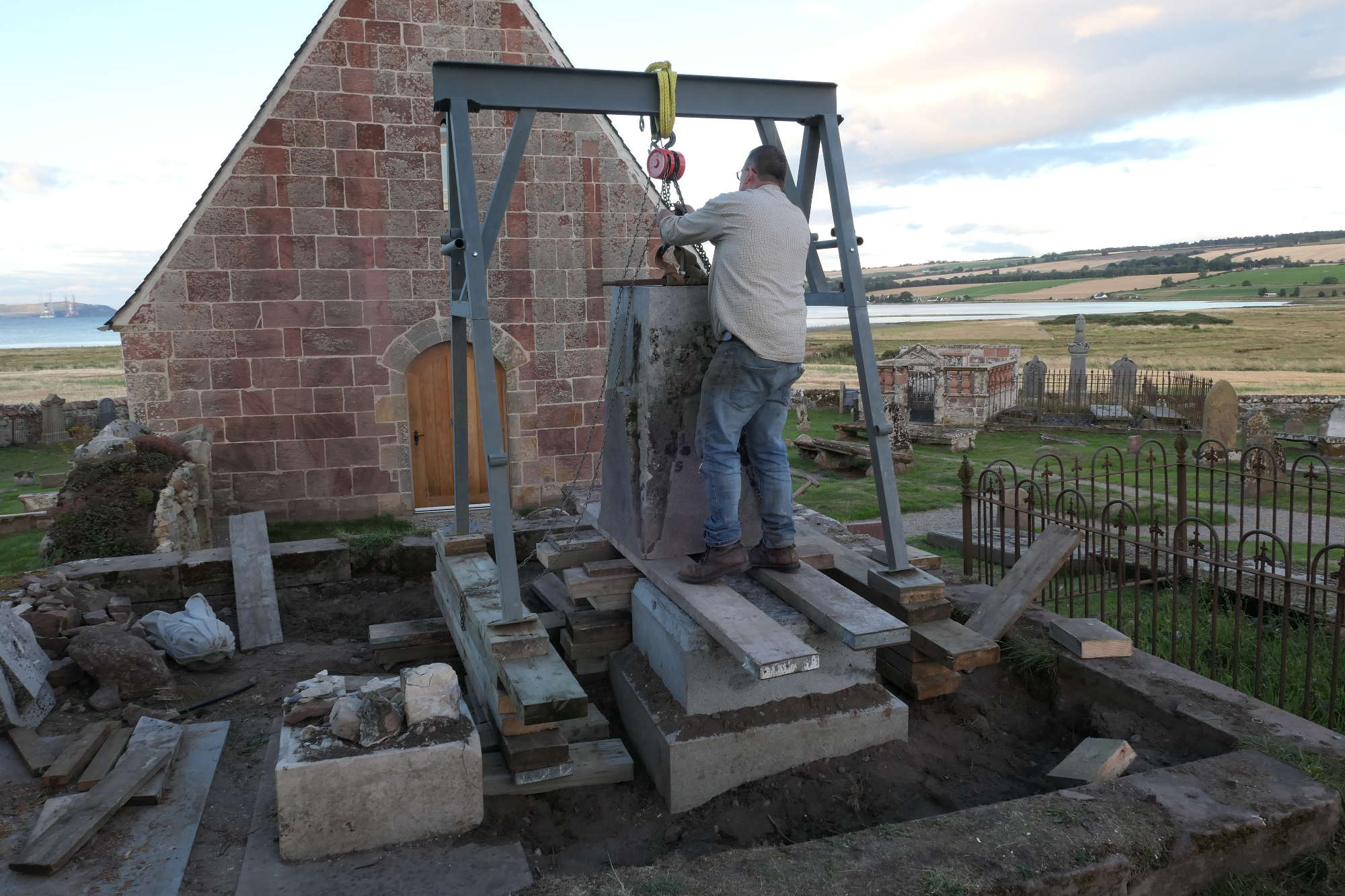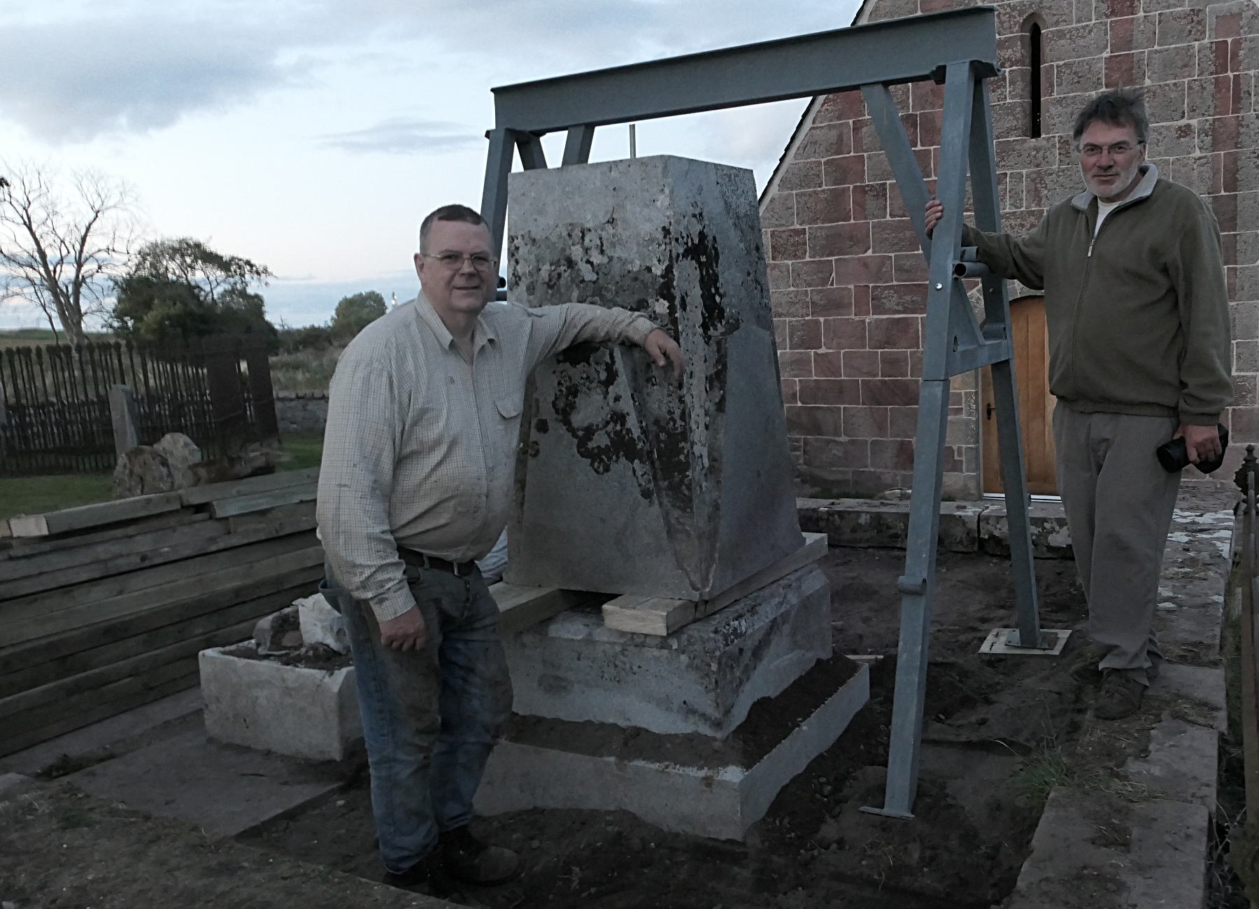 Okay, that one tonne granite pyramid, held by that thin pin set in resin, has to be lifted up onto the base slabs. Lots of timber supports are mustered, all manufactured appropriately from the props which previously had held the buildings at Kirkmichael up!