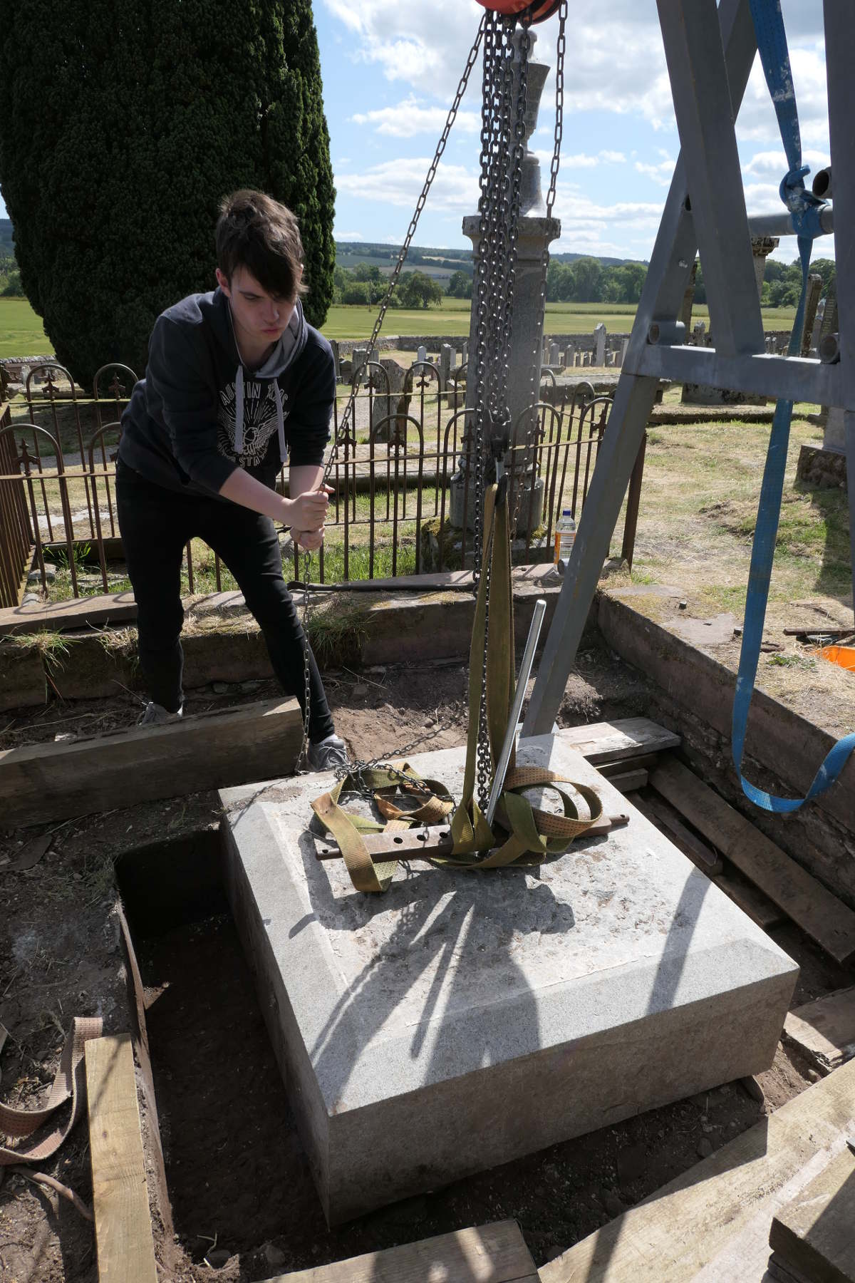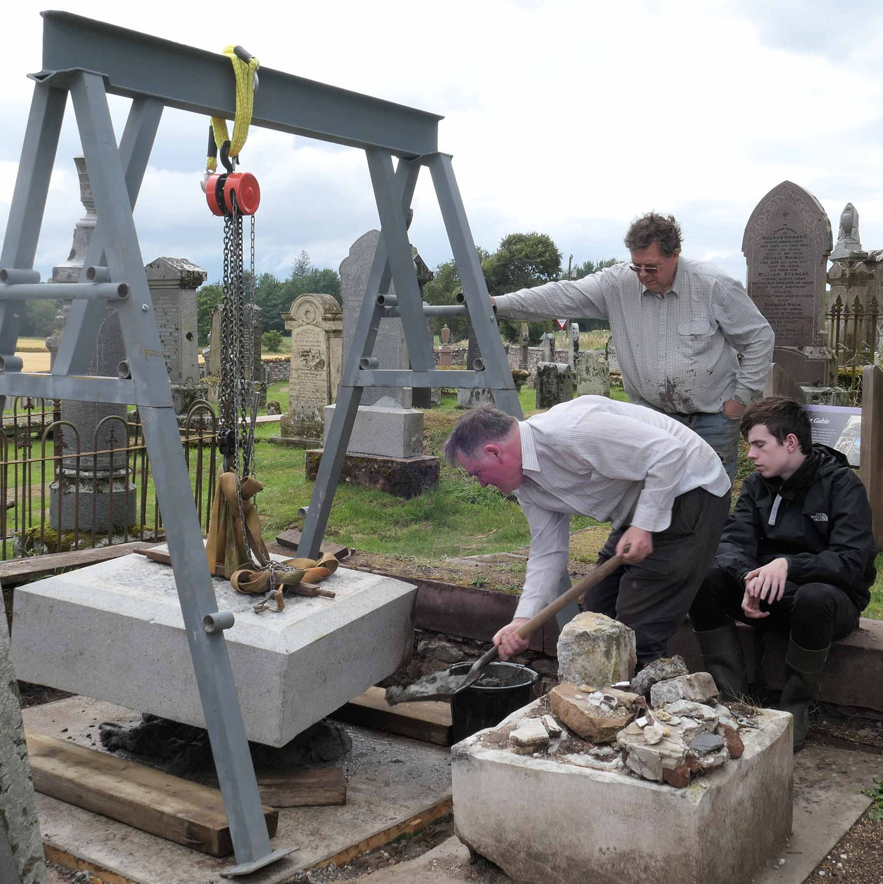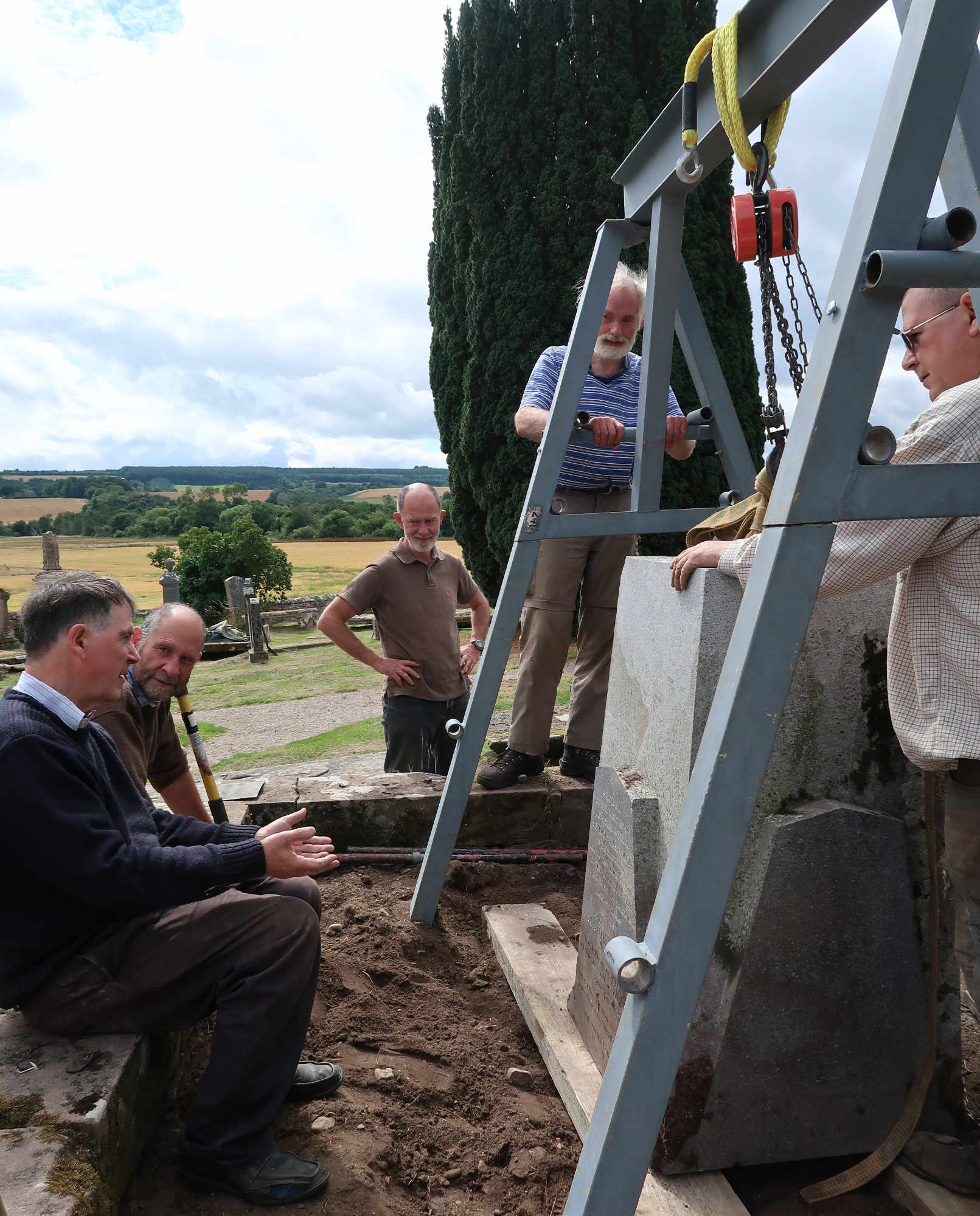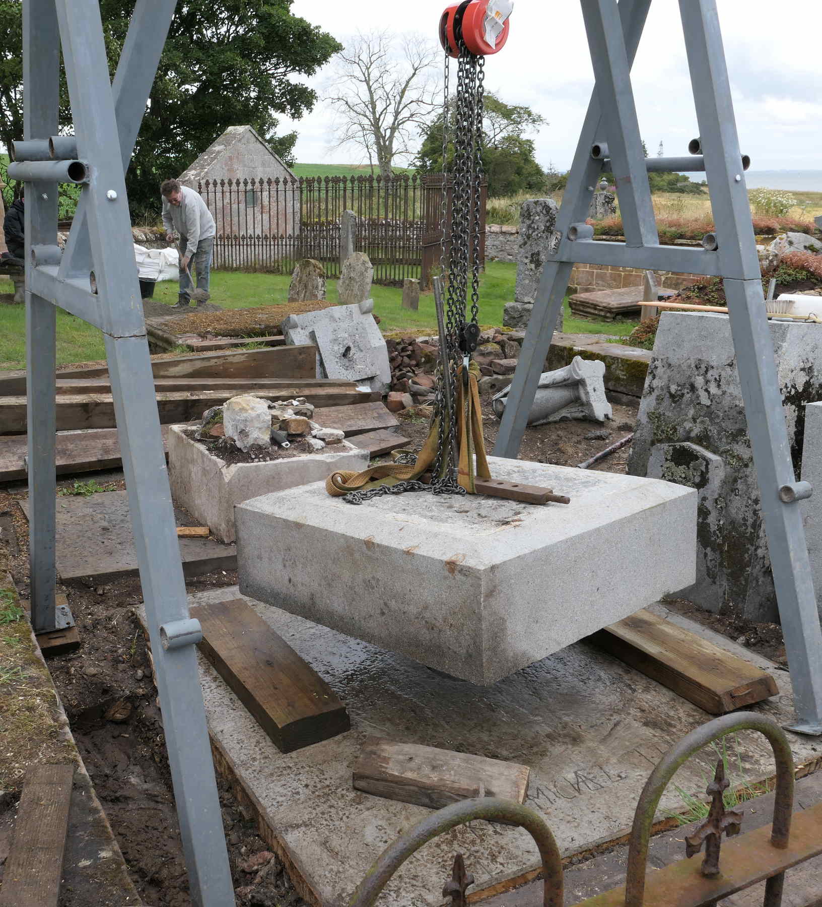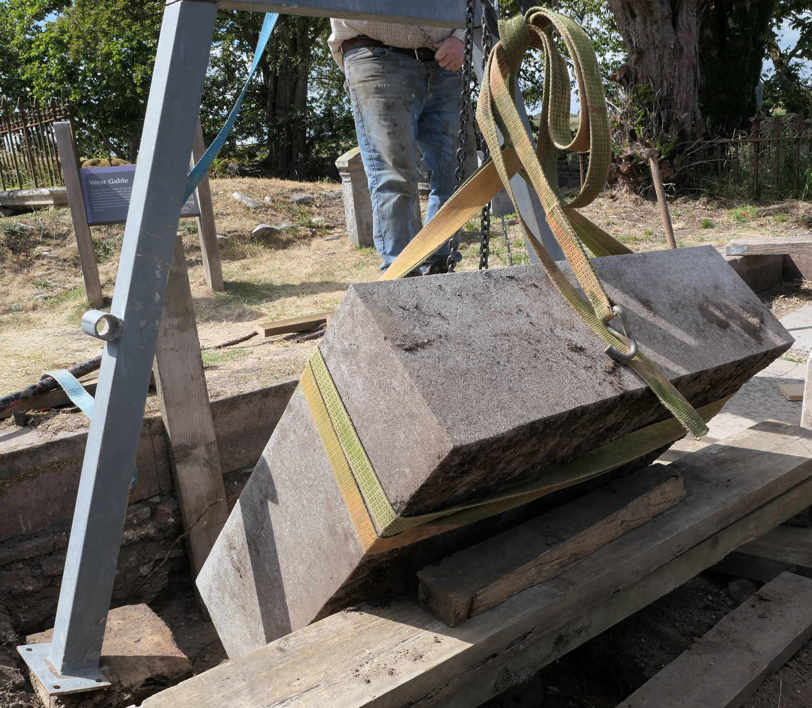 Okay, that one tonne granite pyramid, held by that thin pin set in resin, has to be lifted up onto the base slabs. Lots of timber supports are mustered, all manufactured appropriately from the props which previously had held the buildings at Kirkmichael up!
