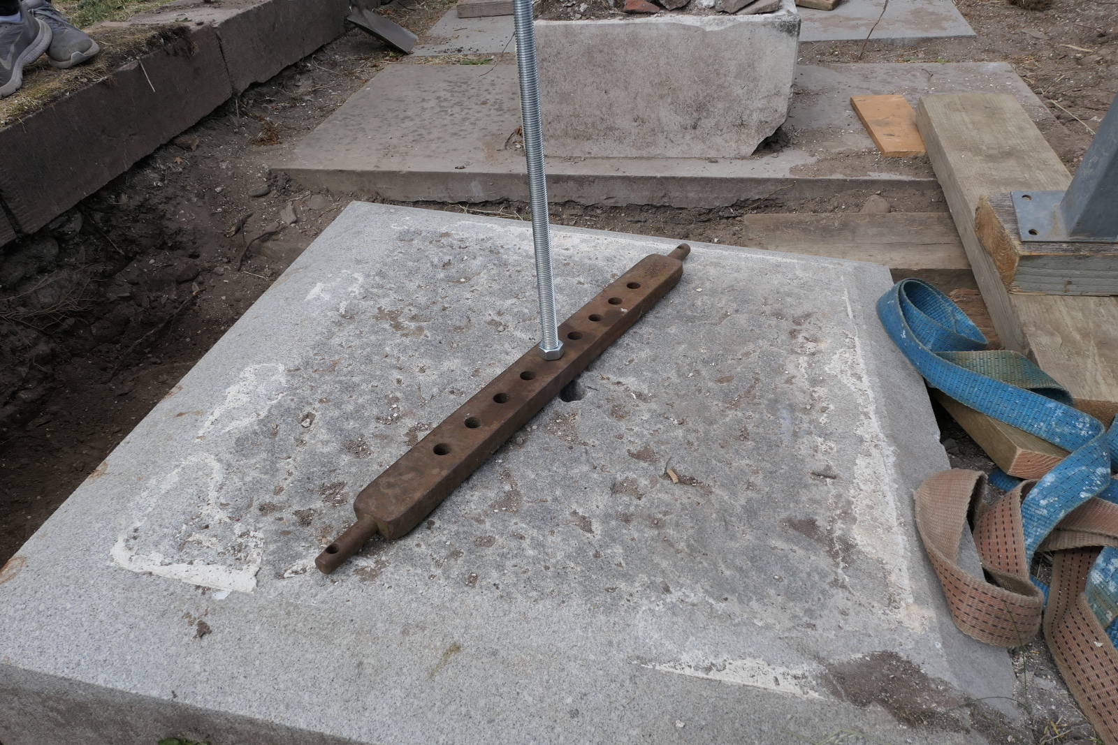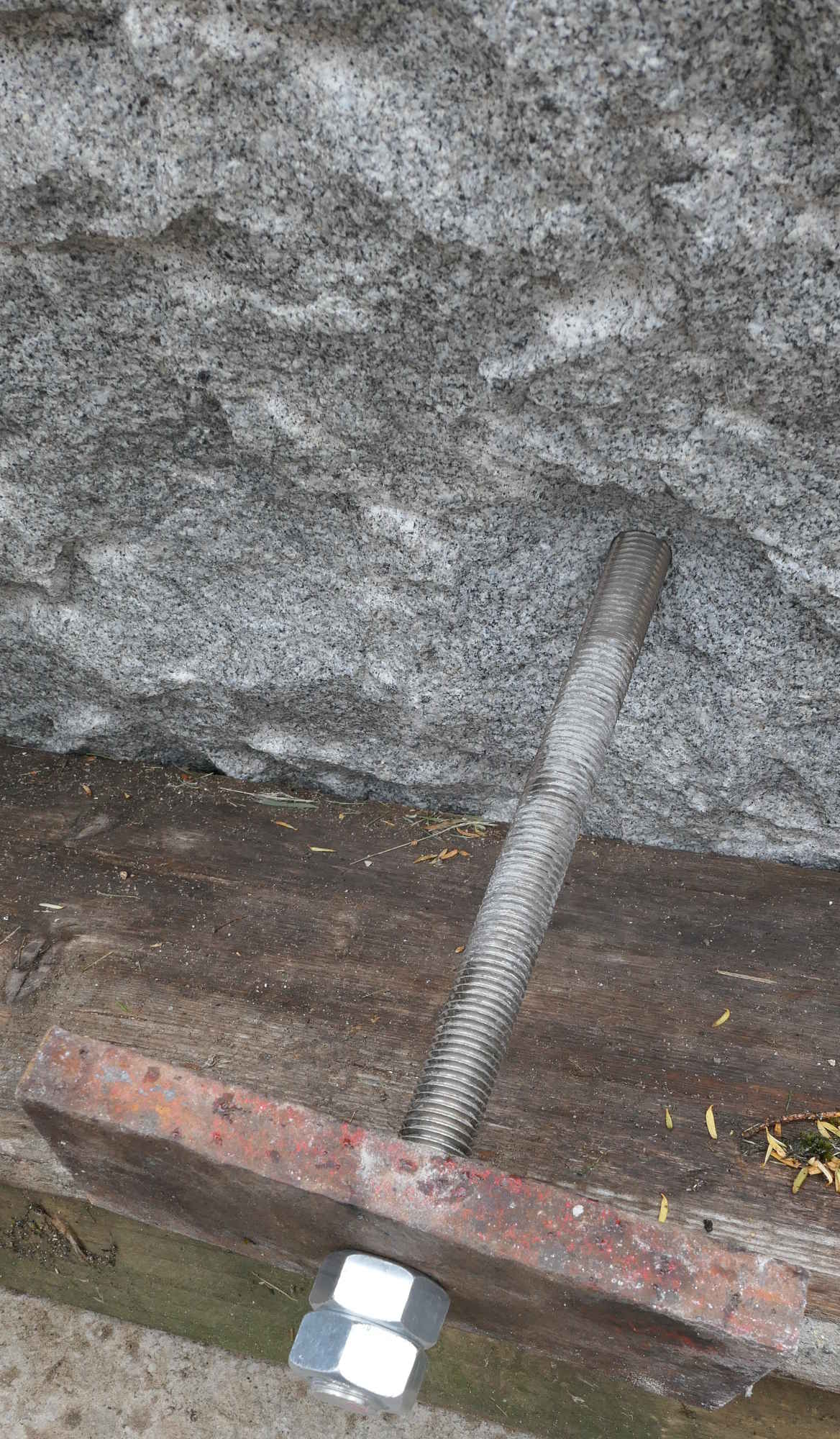 The biggest granite block was drilled as deeply as possible to anchor a steel pin with resin.