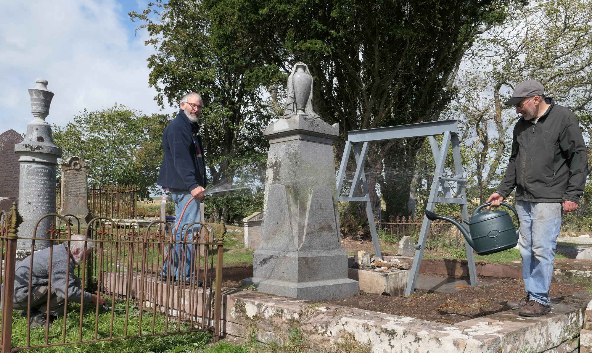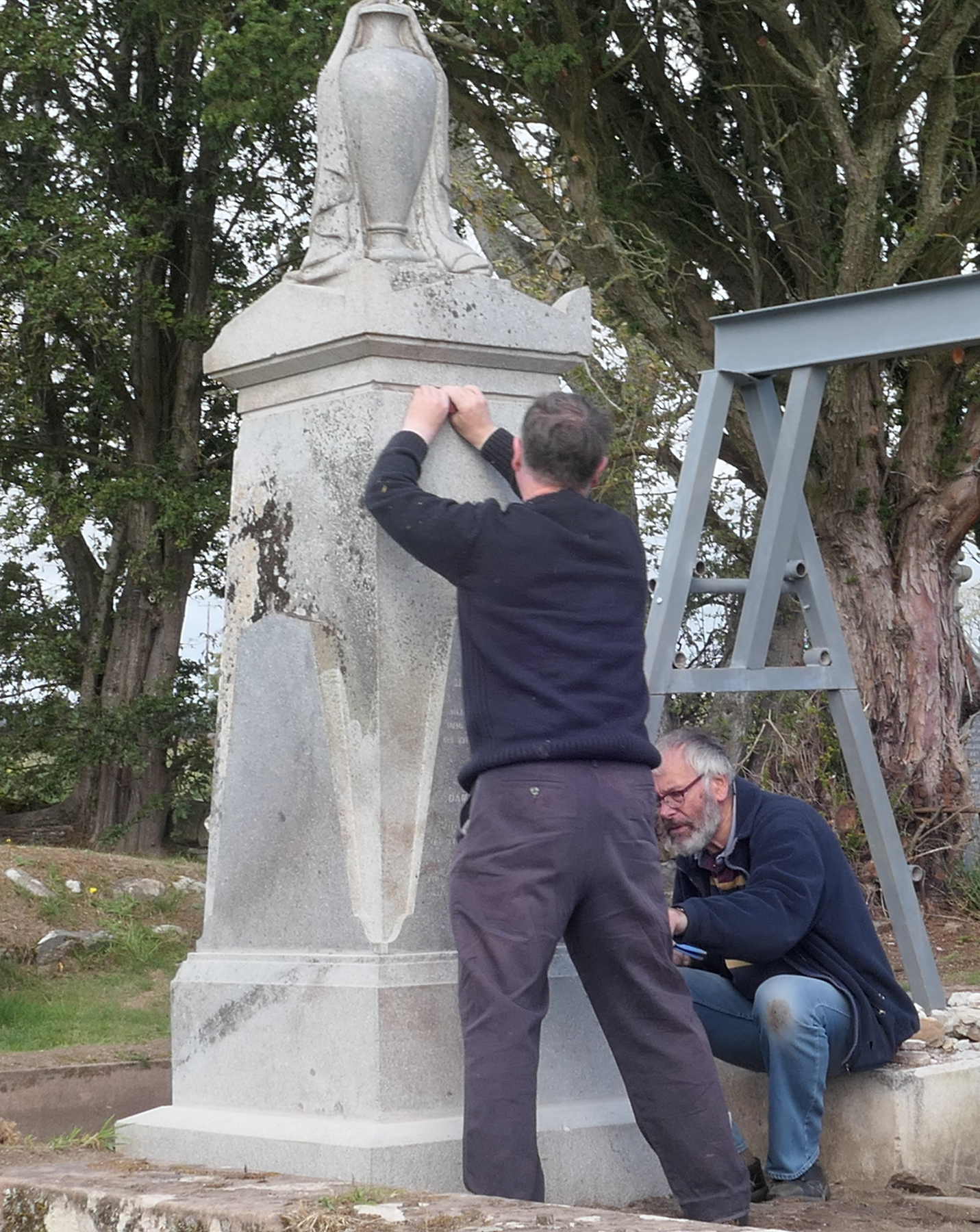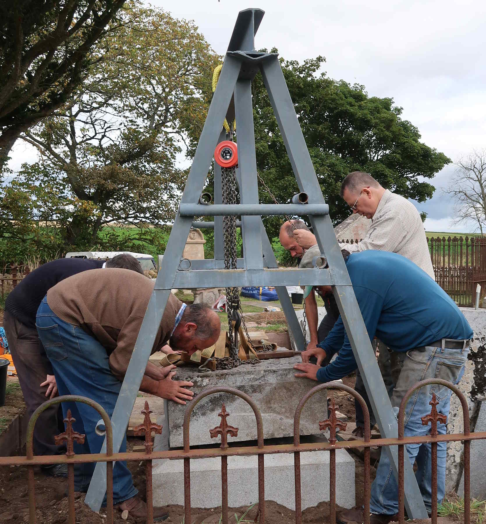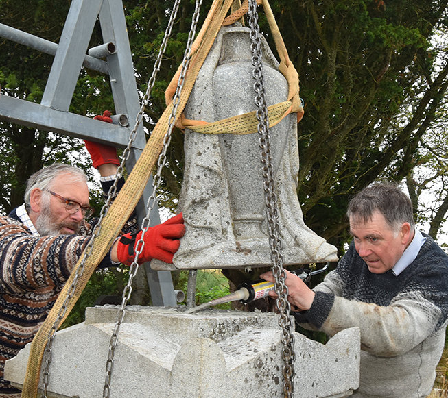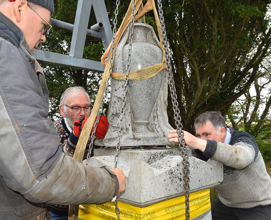 We were under no illusions about the weight of the memorial. The main block of granite had up to 2005 lain flat on its face. In that year, brother George and I had used wooden props and an agricultural jack to prop it at 45 degrees in order for the inscription to be read, and had struggled. Now that we were going to restore it we did some calculations from dimensions and the weight of granite and realised that the whole edifice weighed well over two tonnes.