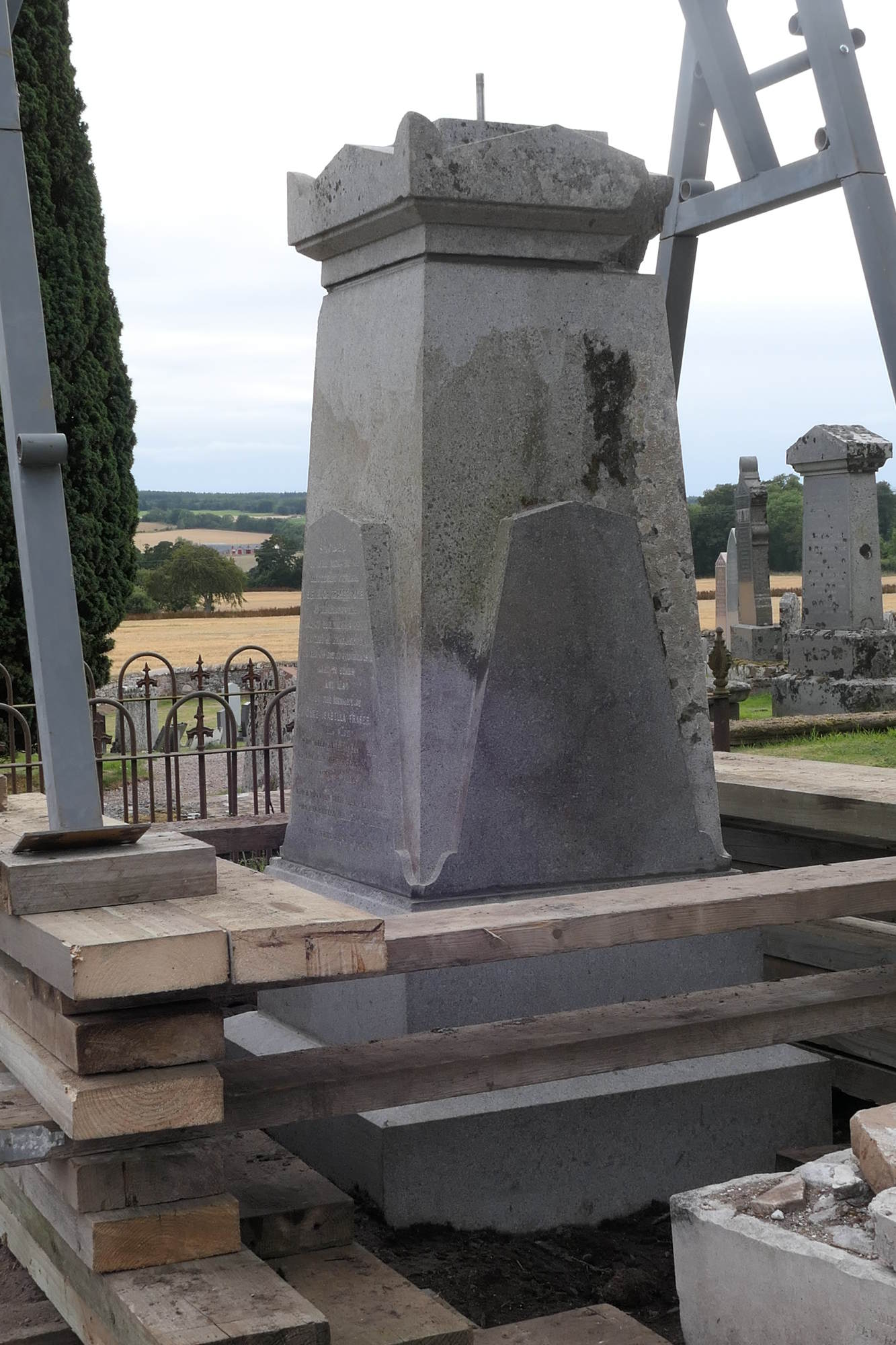 It had toppled over – or had been pushed over – before 1906, the date of the postmark of the first photograph (a postcard) featuring Kirkmichael. Its lower parts jutted up at various angles within the walled enclosure within which it had sat. The crown had ended up beside the arched tomb recess. And the urn had somehow been dumped on a tablestone around the back of the nave, smashing the tablestone. In 2018, the Kirkmichael Trust, having successfully restored the buildings at Kirkmichael, now turned their attention to repairing and restoring the memorials within the kirkyard. More than two dozen stones which had fallen over or broken were fixed. But the sheer scale of the Sir Hugh Fraser memorial was daunting. And it lay within the scheduled area, which put more constraints on restoration work. With the removal of scheduling (job done!) in 2018, we moved into action.