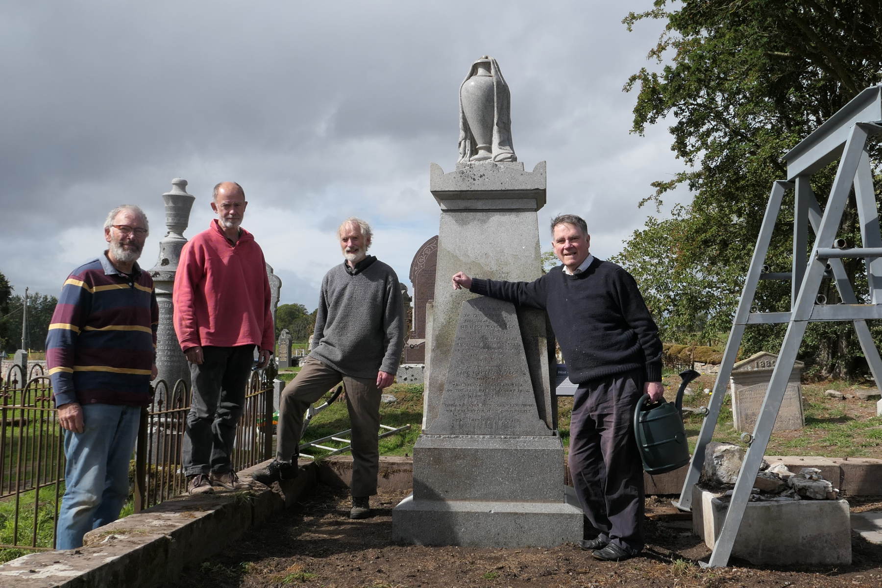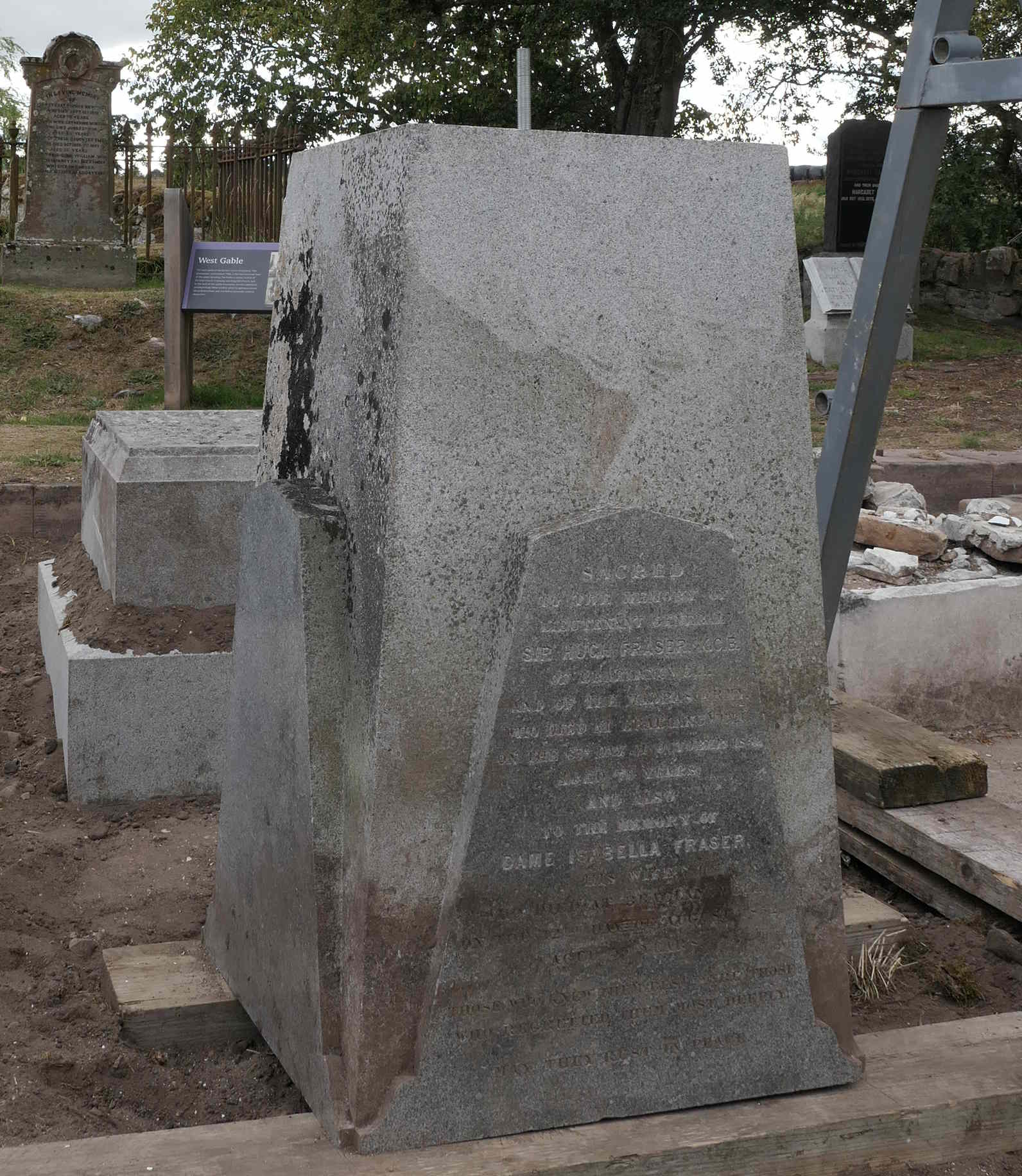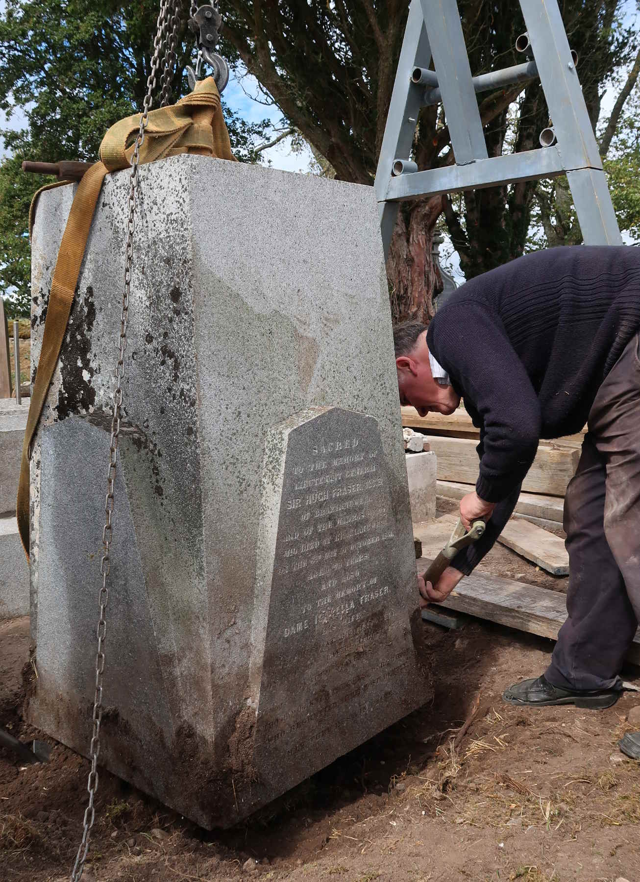 Clearing much of the soil and turf around the fallen memorial revealed that there was a hitherto unknown plinth, 0.99 m by 0.99 m by 0.32 m, adding up to an additional 0.9 tonne of granite to be shifted. It was tilted over, but not so much as to cause the dramatic collapse of the whole edifice. There is the theory that his memorial was pushed over deliberately. Given how unpopular General Sir Hugh Fraser was during the Disruption Riot and its aftermath in 1843, when even his coachman was stoned by Free Church supporters, then the theory is credible. And yet, Sir Hugh had many good aspects to his character.