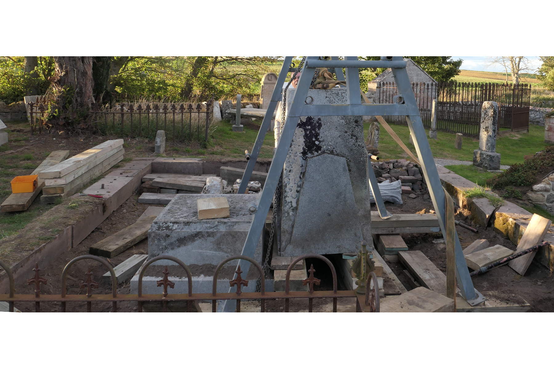 We cautiously raised the pyramid, sliding in wooden supports as we went, elevating the Kirkmichael Gantry three inch slab by three inch slab, and at the same time moving the pyramid towards the memorial base slabs. In the late evening gloom we eventually reached the height of the supports and bridged the gap.