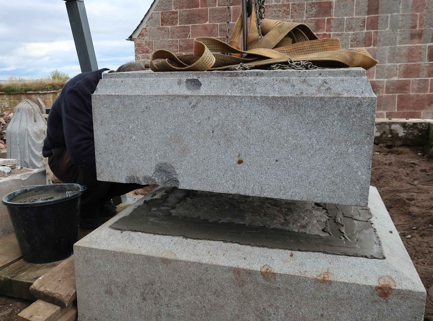 A strong volunteer was deployed at each corner to let it settle exactly where it should be. A perfect job. The protruding threaded bolt was soon whizzed off with an angle grinder. The mortar was smoothed and covered with plastic sheeting while it cured, to avoid drying prematurely.