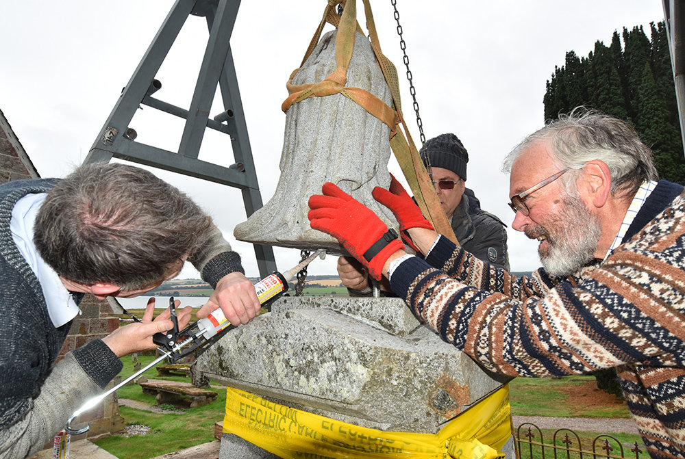 A couple of days later we’re back, determined to get the urn on. We had to adapt our lifting style here as we couldn’t drill a hole into the top of the urn! Instead, George ties a neat sling around the urn, and we winch it above the crown. We didn’t think that ordinary mortar would be safe enough to hold the urn, despite the anchoring pin, so we pumped anchor resin into the locating hole and over the entire base and carefully lowered the urn to complete the restoration.