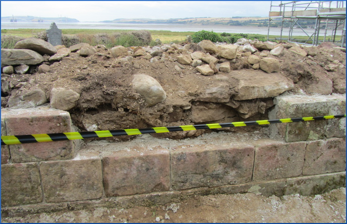 While the Kirkmichael project was gaining momentum, the condition of the tomb was the cause of increasing concern; the memorial had cracked across at some time before the 1990s, and in 2015 had fallen out altogether. The top of the tomb was sinking in while the walls were bulging out. Protective fencing was erected around the structure to keep the public safe (always something to resist, as it is an admission that a building has passed the point of no return, and buildings behind such protection inevitably continue to deteriorate until they collapse).