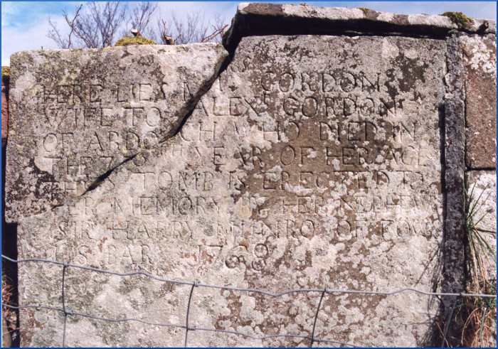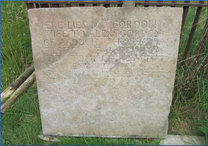 Here lies Mrs Gordon, wife to Alexander Gordon of Ardoch, who died in the 75th year of her age. This tomb is erected to her memory by her nephew Sir Harry Munro of Fowlis, Bart., 1768.