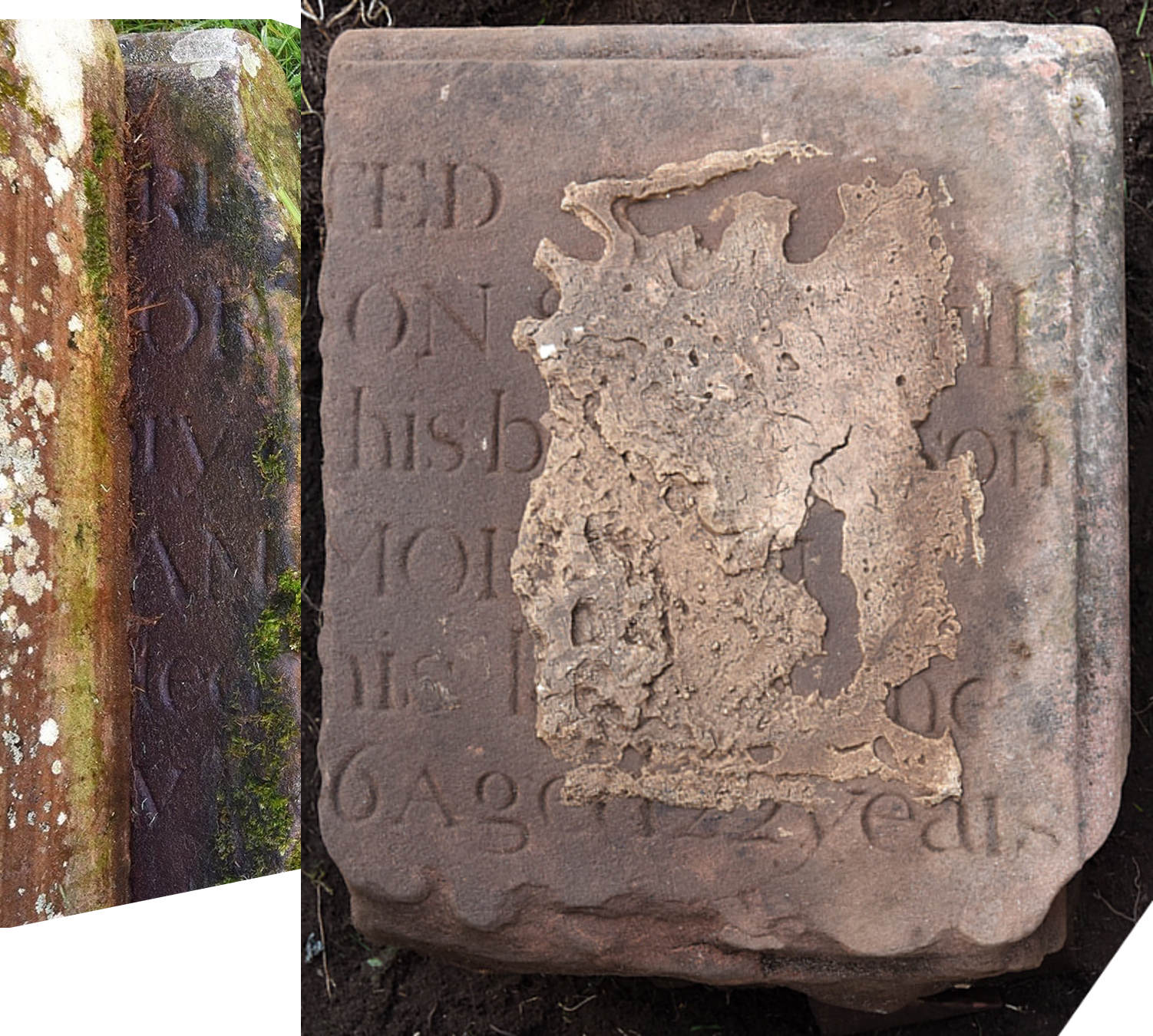 The foundation slab bearing the headstone for Robert and Janet has an unusual shape. We studied it closely in December 2018, removed some moss and realised it was in reality the top left hand quarter of a slab from a tablestone. Several letters are visible on the projecting edge. In the evening after this discovery, having thought about it a bit, I had a look at the photographs of another section of a tablestone we had found acting as a foundation for a small headstone just a few weeks earlier. Only a few letters were visible as there was lime mortar smothering most of it. Nevertheless, I adjusted the perspective of the two parts to put them on the same plane and aligned them – and astonishingly found we had much of a third Morison inscription. In the following, characters within square brackets are reasonable assumptions; the emboldened text is on the piece found under the Robert Morrison headstone: