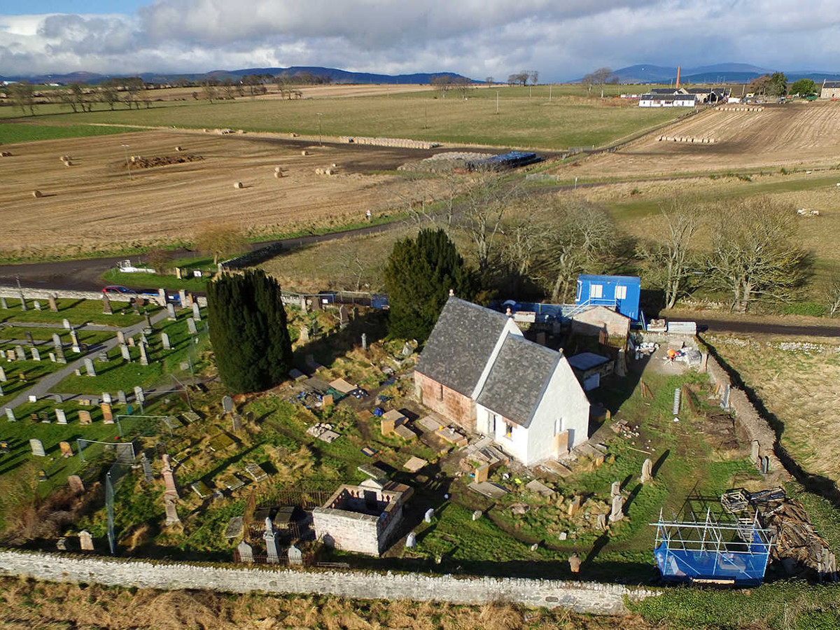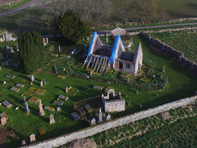 1 August 2016: flight over Kirkmichael after scaffolding complete, memorials enclosed in protective boarding and some memorials removed or taken down for repair.