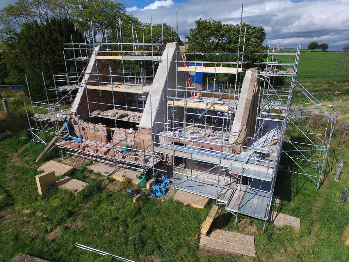 3 September 2016: gables and walls now plastered with traditional lime plaster and walls repaired with coping replaced, south wall being rebuilt – the building is now coming together again!