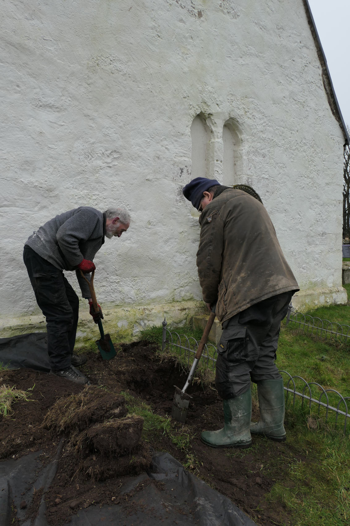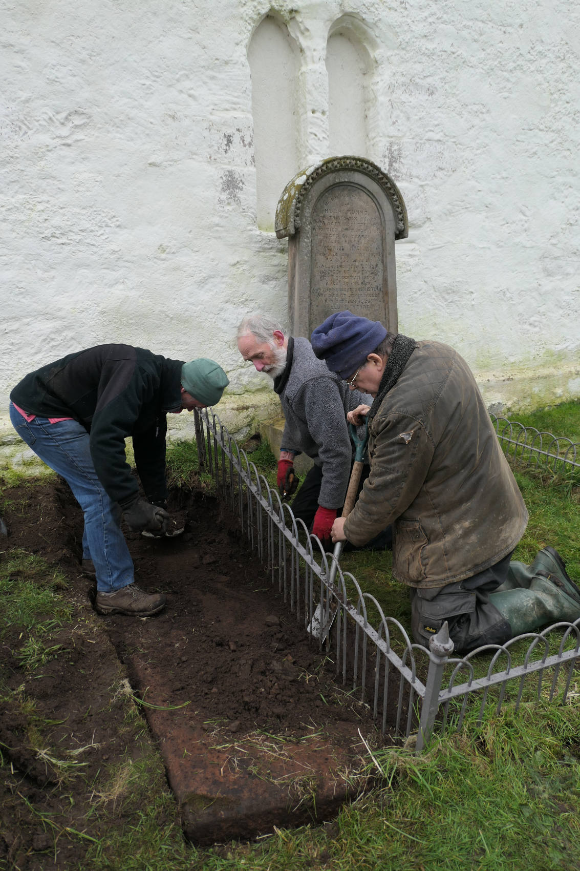 Neil gamely re-excavated the slab, soon locating the protective tarpaulin, which by now had roots growing through it. As one approached the wall of the chancel, the soil rises so there is a good depth to remove closer in to the wall. A position close to the church, of course, can often be an indicator of the importance of the family commemorated on a slab.