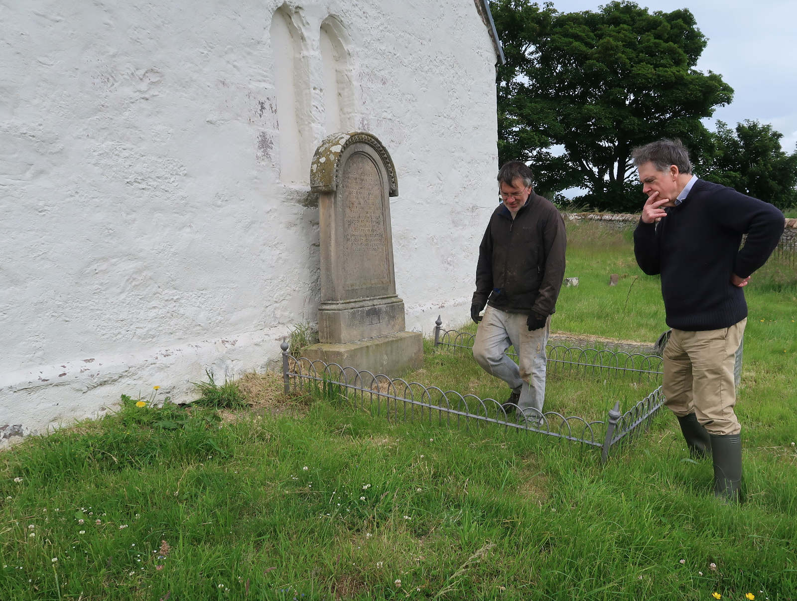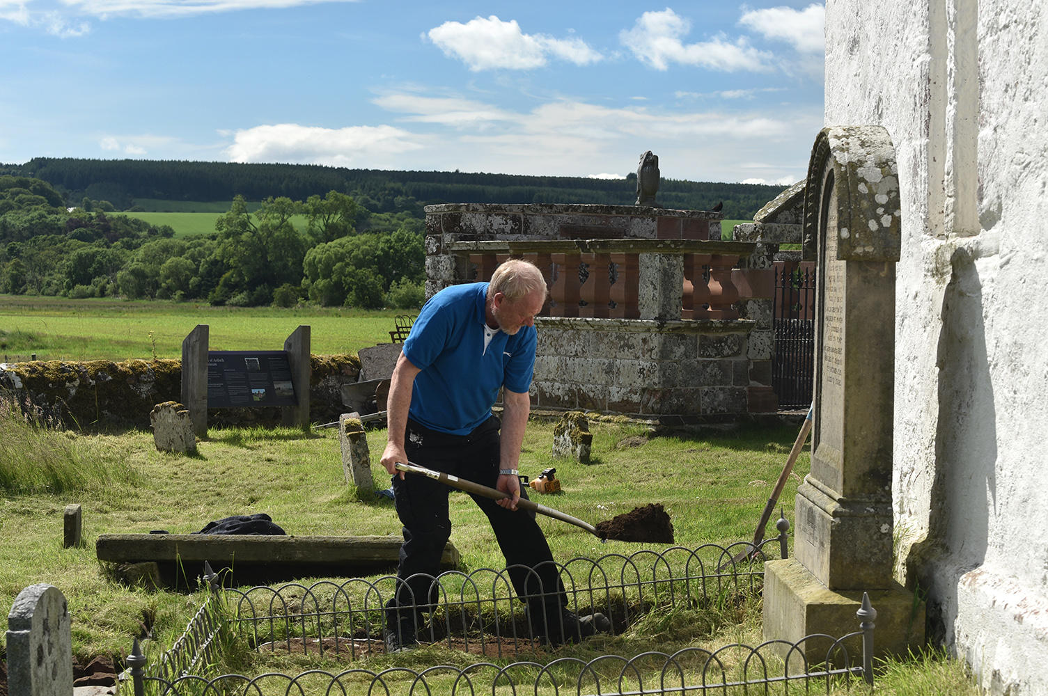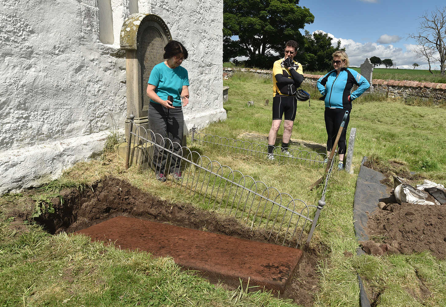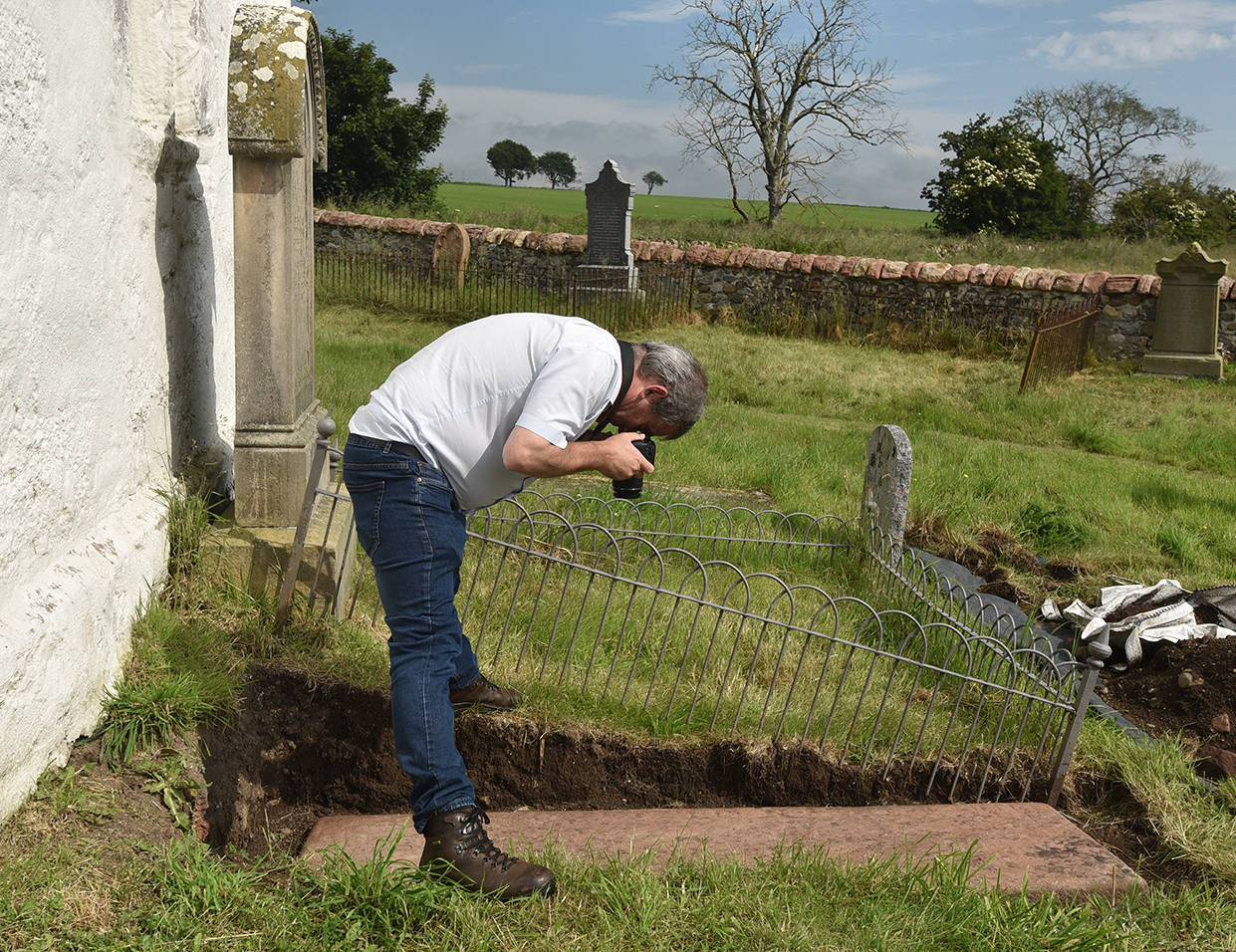 With the slab temporarily exposed, Davine takes the opportunity to tell our passing cyclists, Shirley and Alastair Matheson from Cromarty, about the old slabs of Kirkmichael and the importance of this one in particular. Andy arrives to take countless pictures to build into his photogrammetric models. Photography finished, we re-cover the slab. A good depth of fine sand is placed on it first, to prevent abrasion from stones in the soil, and we place an enhanced depth of soil and turf over the complete stone, so that it is given much better protection than was previously the case. It is now safe for future generations from erosion, frost and, not least, the kirkyard grass mowers!