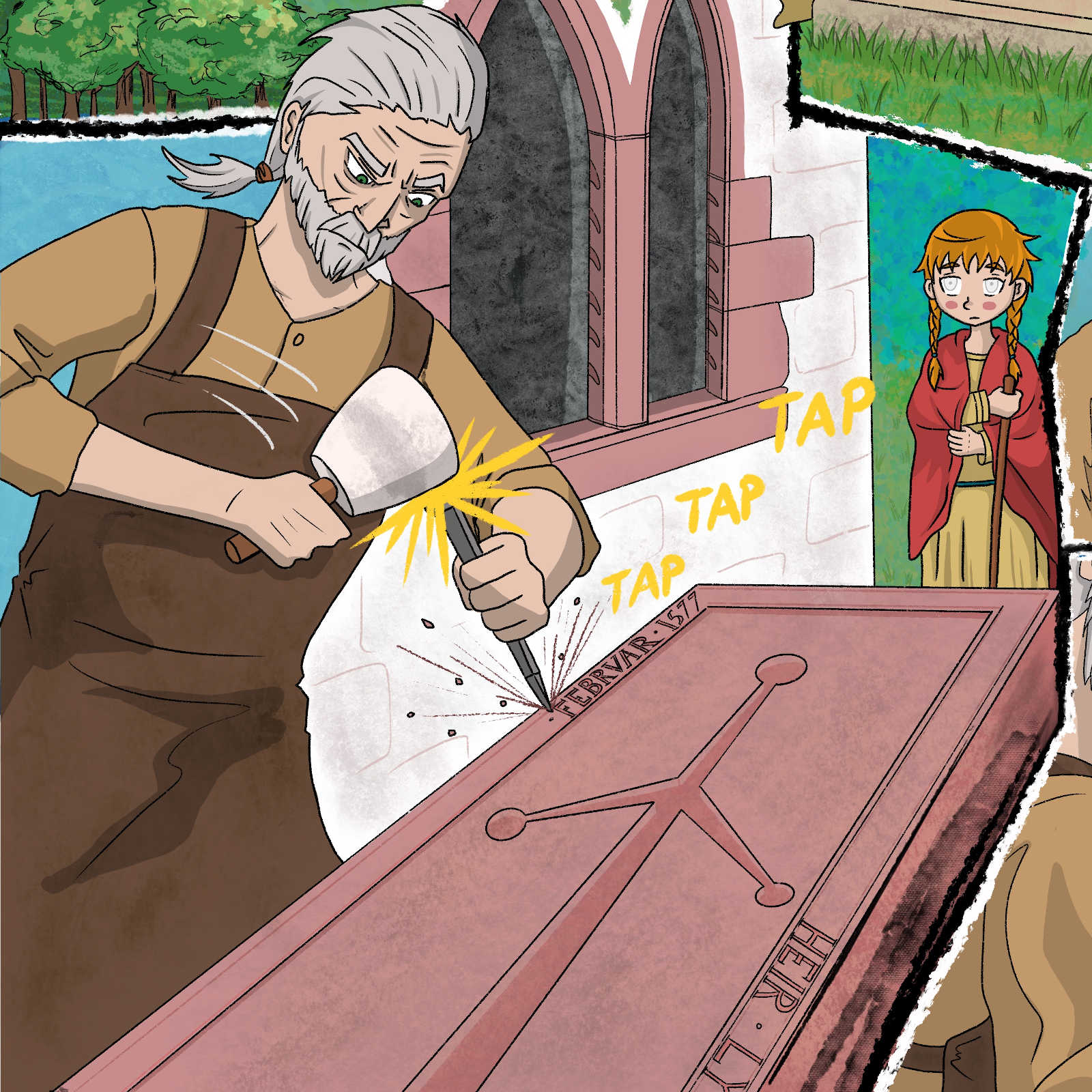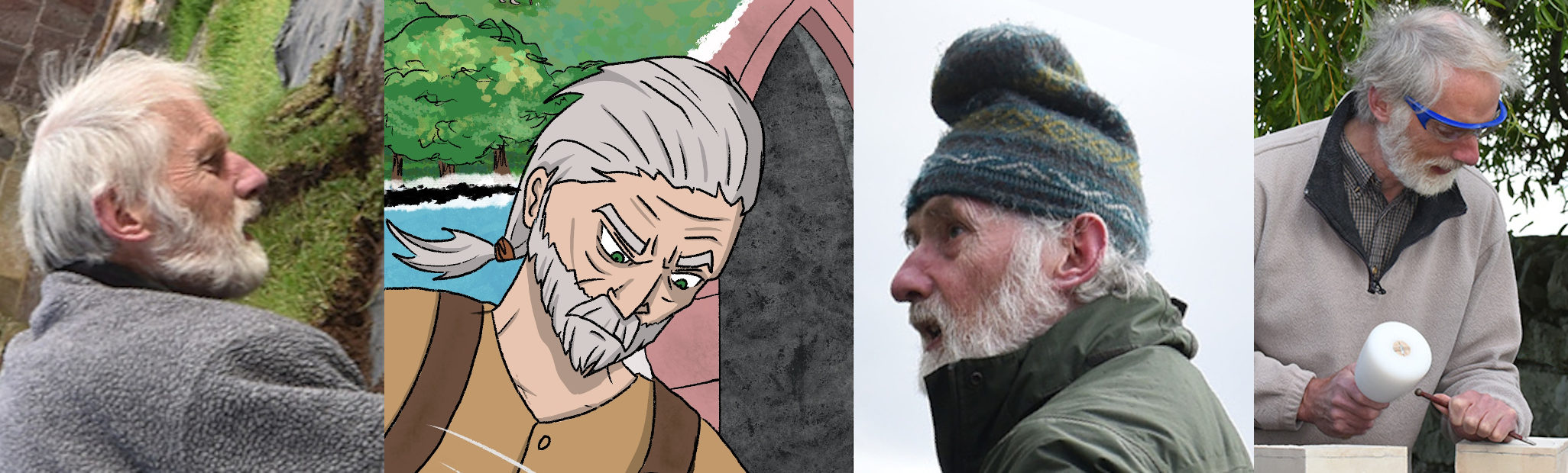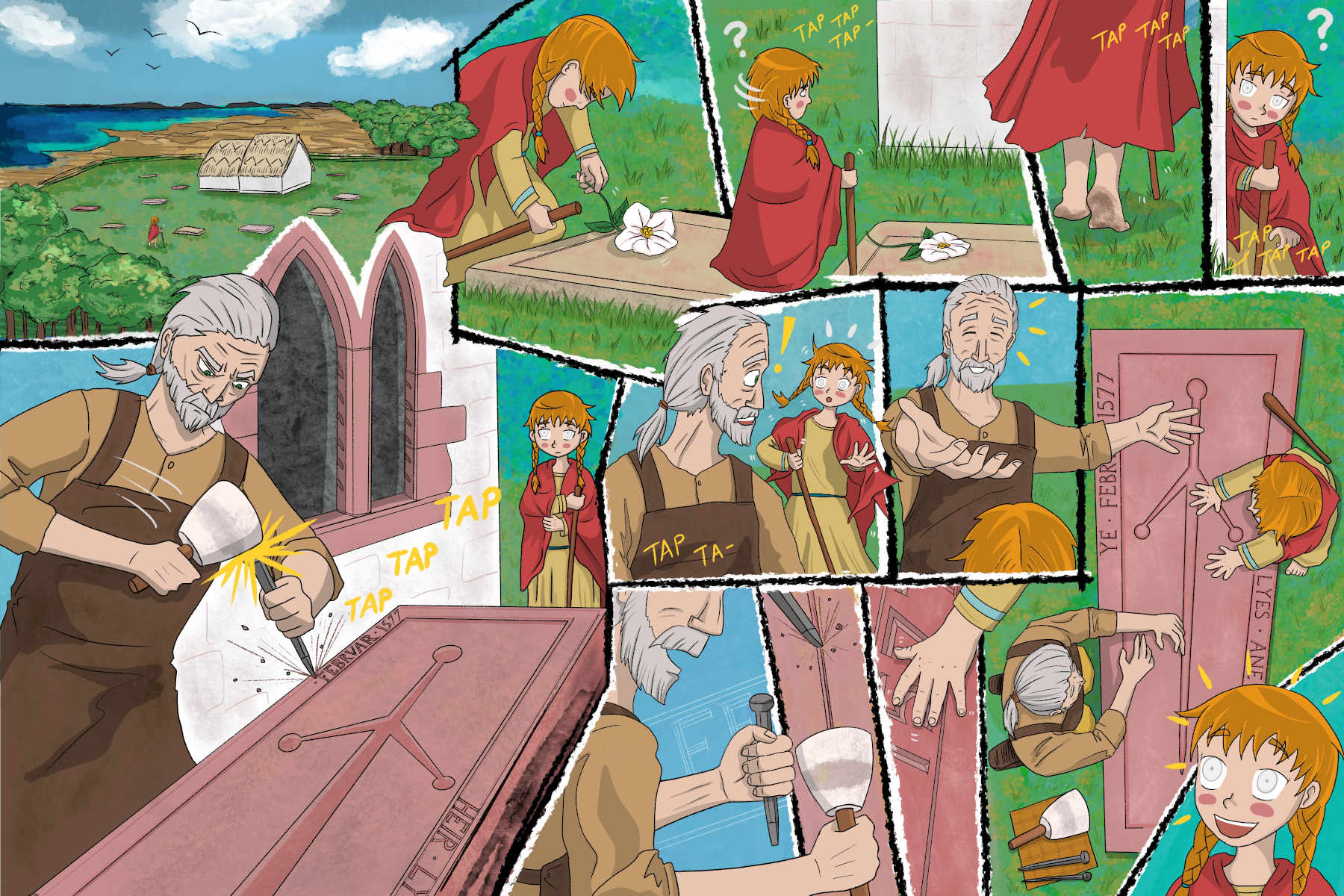 Our artist, with a true sense of the story-teller, felt there would be a stronger narrative with the one child rather than a group. She asked for shots of Kirkmichael set in its landscape (and our drone photography proved invaluable here). She produced two story-lines, one where the story follows the experience of the stone-carver, the other of the girl. We plumped for the one where the story follows the girl, who is drawn round the back of the chancel by the curious sound of the chip-chipping of the stone-mason at work. I felt at the time that the stone-carver looked rather reminiscent, but it was only after the artwork had been published did one of our volunteers, Donald, point out the resemblance between the kindly stone-carver and fellow-volunteer, retired archaeologist Jonathan Wordsworth. He had featured in several of the photos supplied to the artist and obviously had made an impression!
