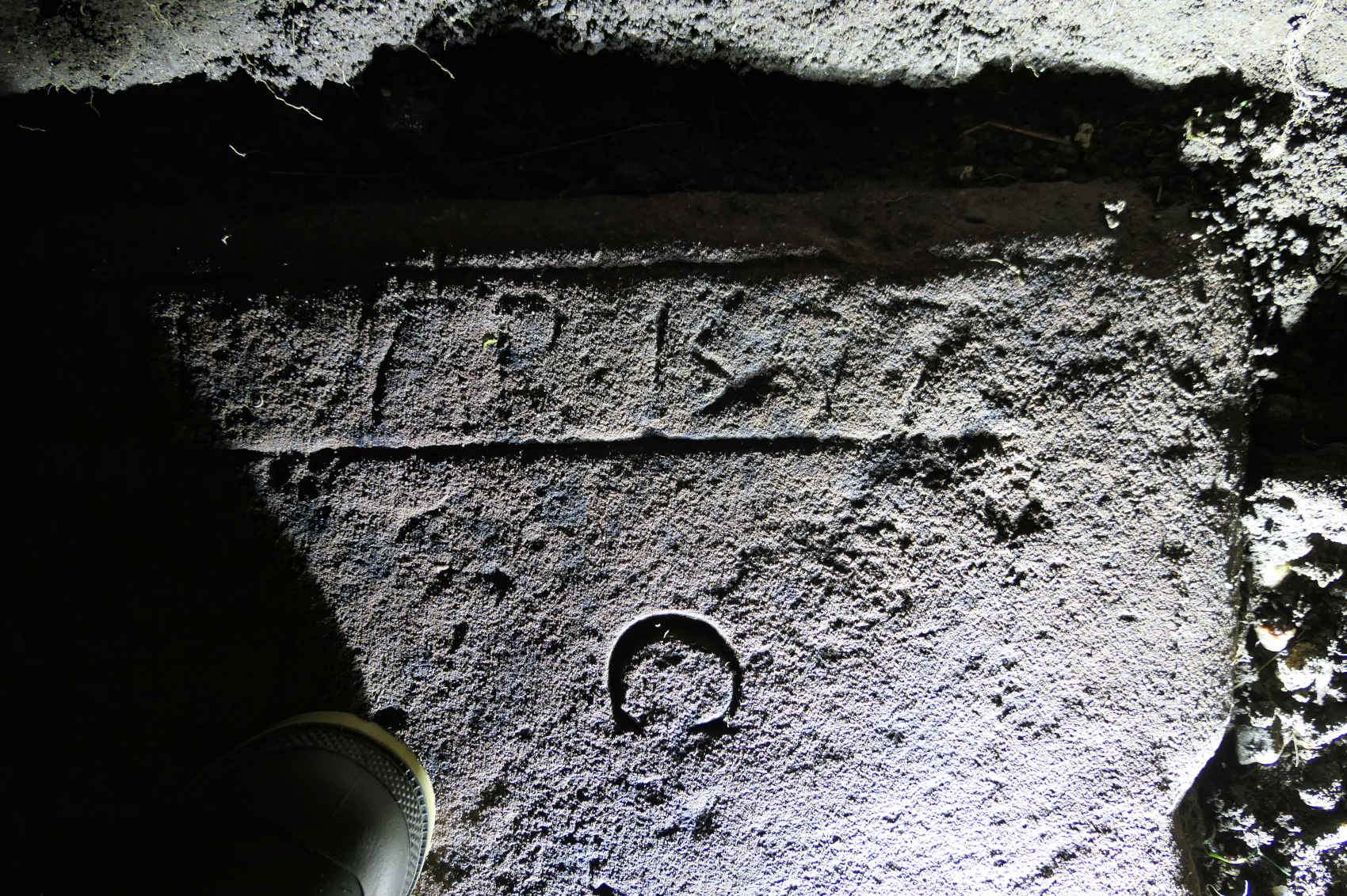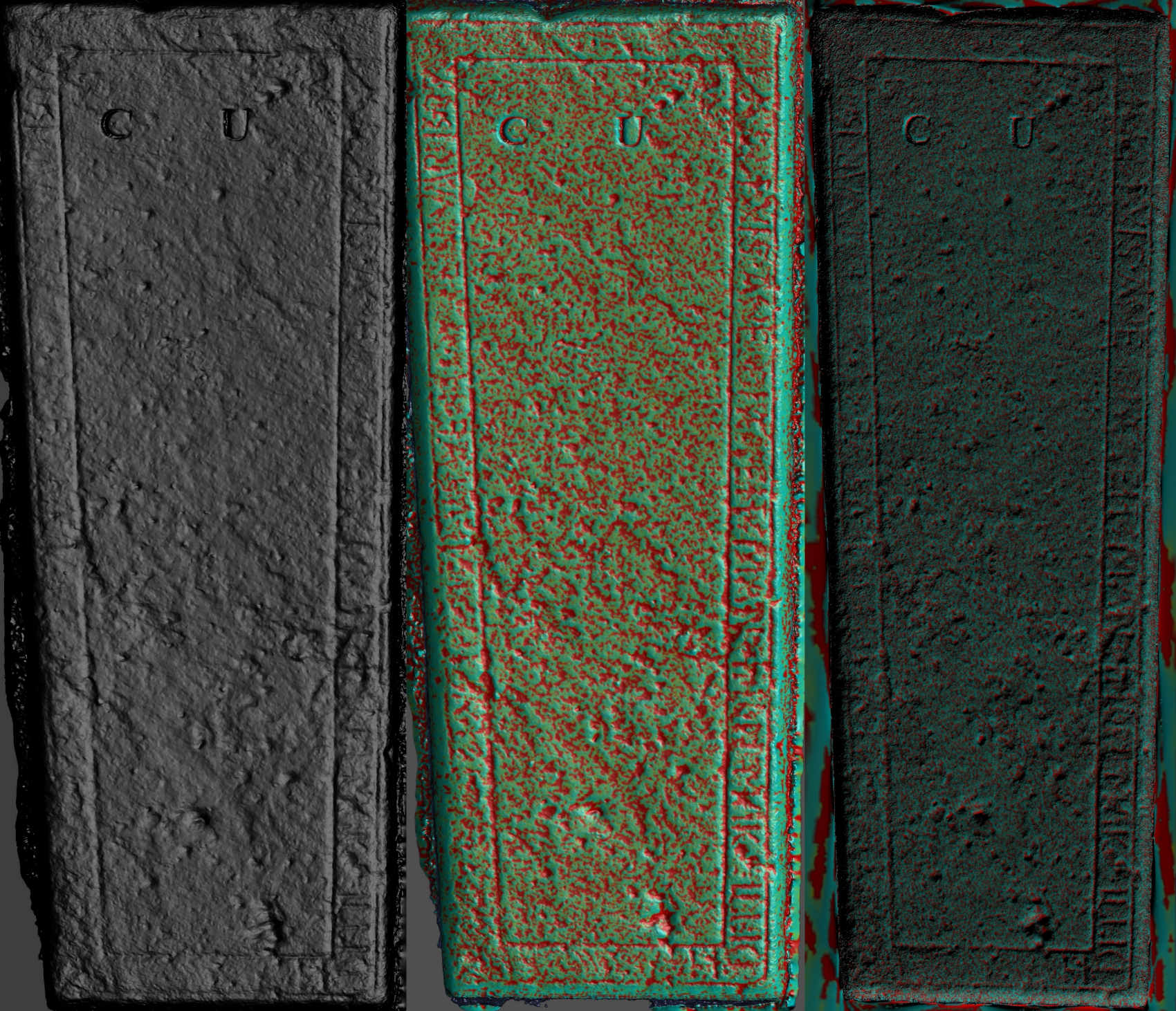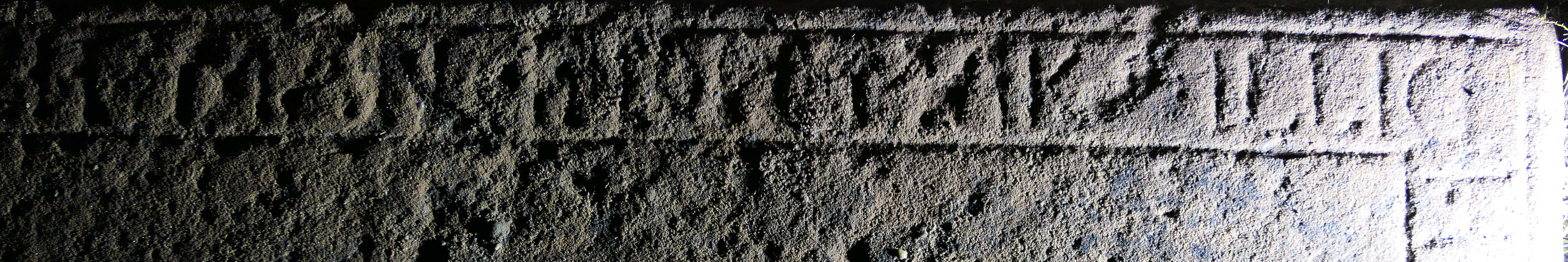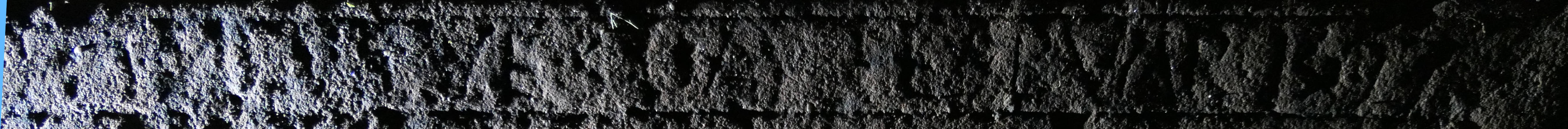 Night-time oblique photography, not very pleasant in the depths of cold, damp December, confirmed enough of the perimeter text to make us decide that we should call in Andy Hickie with his photogrammetric techniques. The slab had obviously been re-used later by “C U” – most likely a Charles Urquhart. But we felt more of the original text around the perimeter could be recovered through photogrammetry.