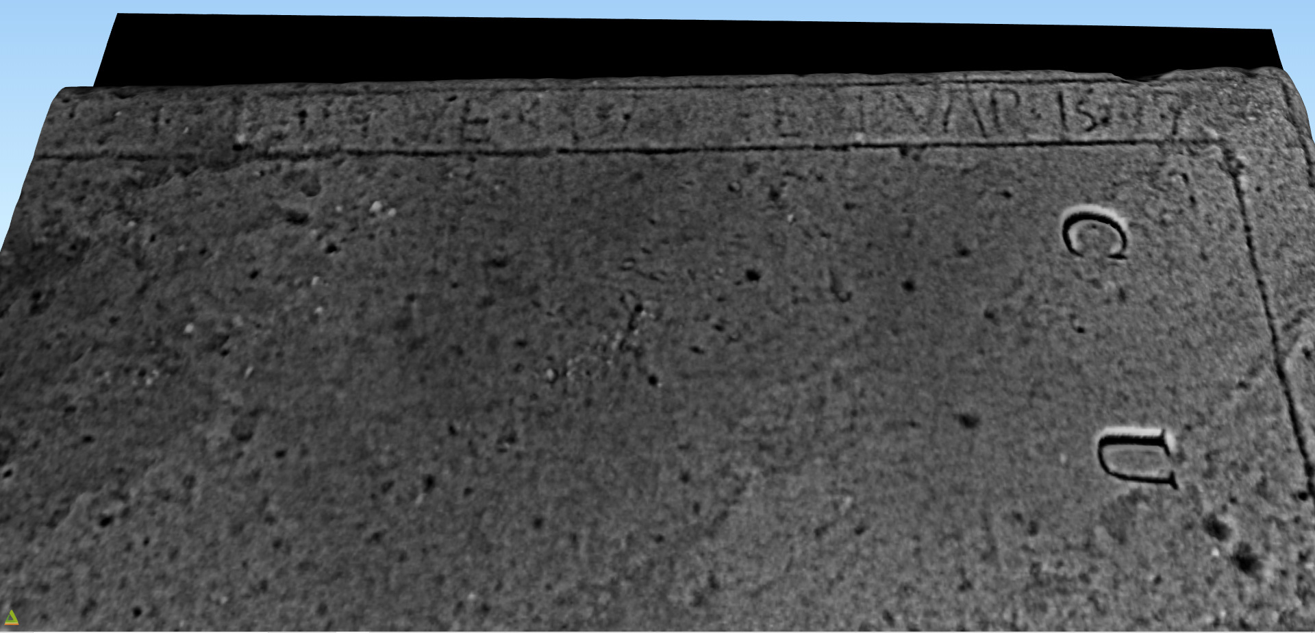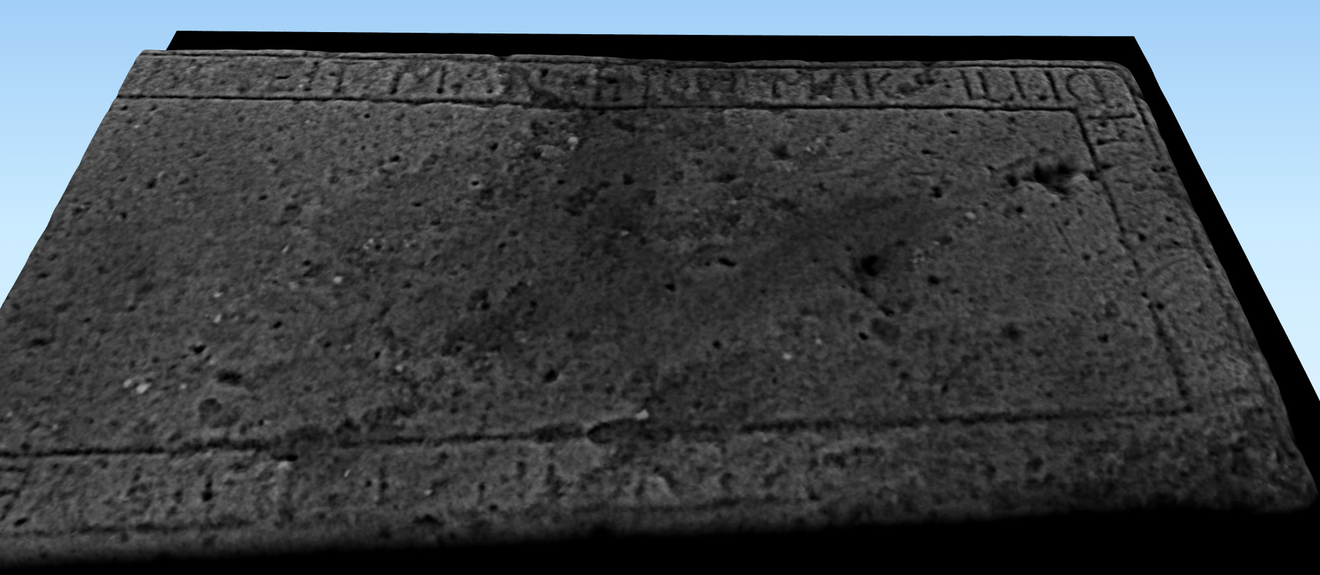 With the data stored in his computer, Andy starts to apply different techniques and adjusts his models and images to start pulling out the detail still remaining on the ancient tombstone. As well as the text a central linear feature starts to emerge. Sword or cross? You would expect it to be a sword rather than a cross on a post-Reformation slab, and sure enough there are just hints of the hilt and quillons suggested.